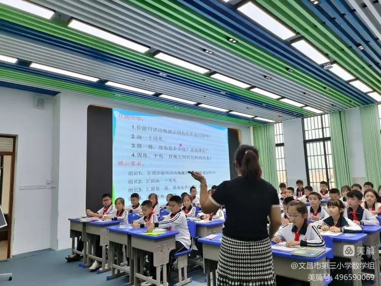 王彩萍老师整个课堂体现让学生在操作中观察问题,发现问题,解决问题的特点,重视学生再操作实践中建立教学模型构建知识体系。回顾锐角、直角和钝角及其度量直角的方法。互助合学中让学生认识平角和周角,以及探究五种角的特点和它们之间的关系。