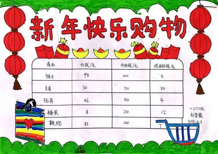 同学们参加了一次家庭大购物,并记录下了所购商品的名称、数量和价格,然后制作购物清单手抄报,这一活动不仅锻炼了他们的数学计算能力,还培养了他们的理财意识和节约习惯。