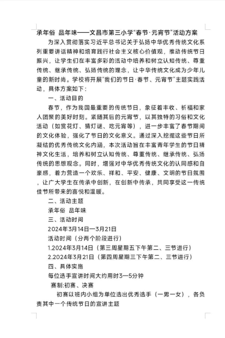 爆竹声中一岁除,春风送暖入屠苏。千门万户瞳瞳日,总把仙桃换旧符。春节作为中华民族最为重要的传统节日,承载了丰富的历史和文化内涵。文昌市第三小学五年级在学校教育部门的组织下,于3月21日,进行以“春节”“元宵节”为主题的宣讲活动。通过宣讲活动,我们可以向大众传递春节的起源、习俗、故事等,让人们更加深入地了解和感受传统文化的魅力。这不仅有助于增强民族自信心和自豪感,还能激发人们对传统文化的热爱和传承意识。