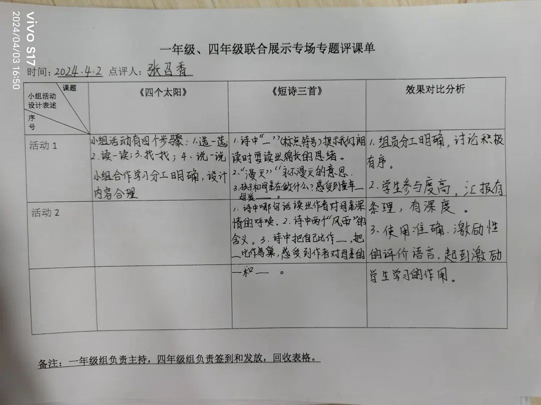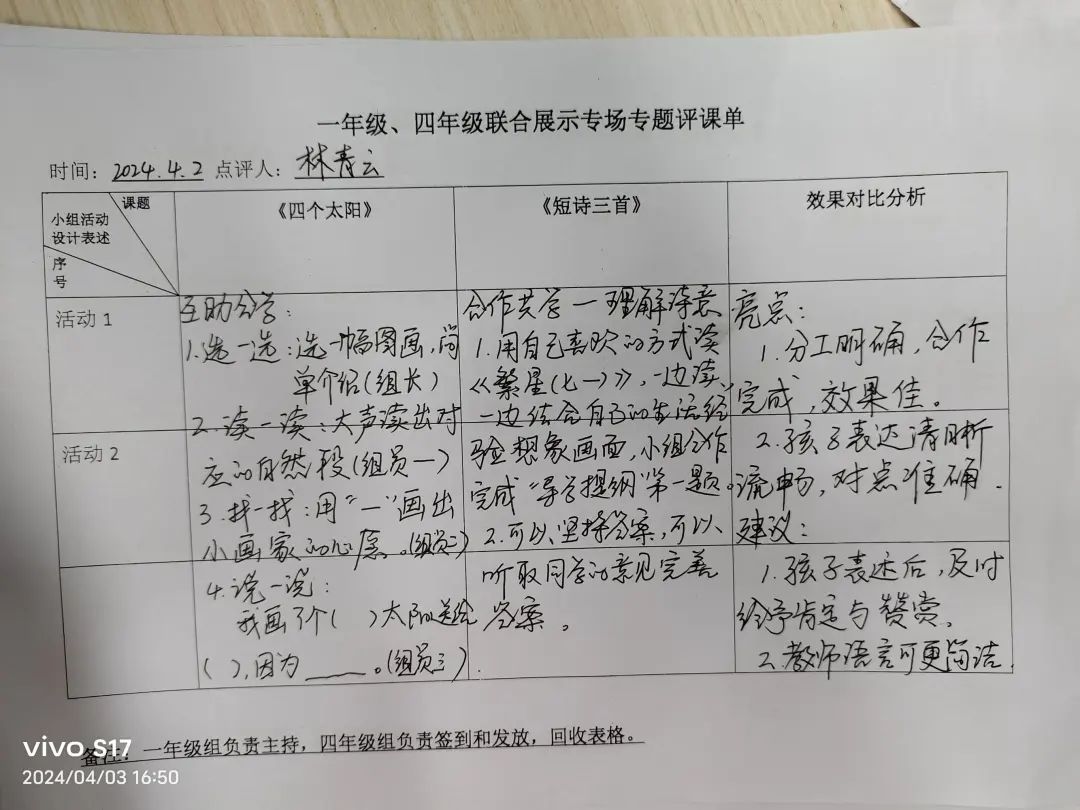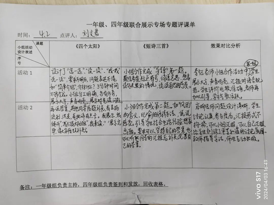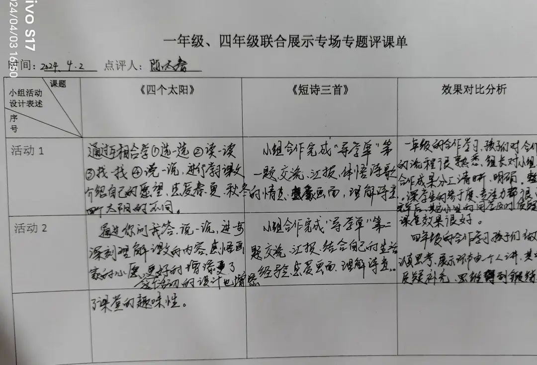 我们四年级语文组老师在符少灵备课组长的组织下,就课例《短诗三首》进行集体备课。我们从新课标、单元导读、教材等方面着手,围绕单元语文要素出谋划策,集思广益,群策群力,最后形成了我们教学预案。