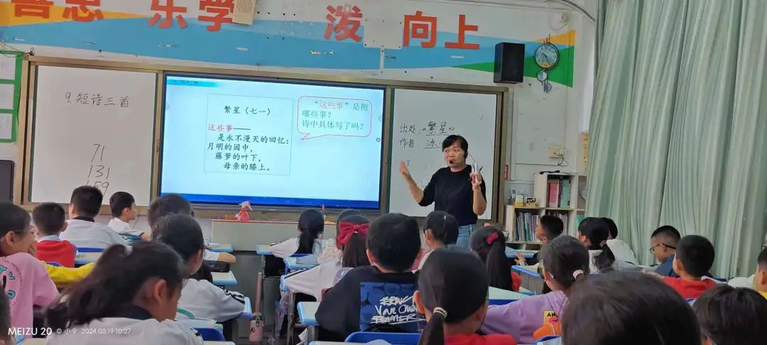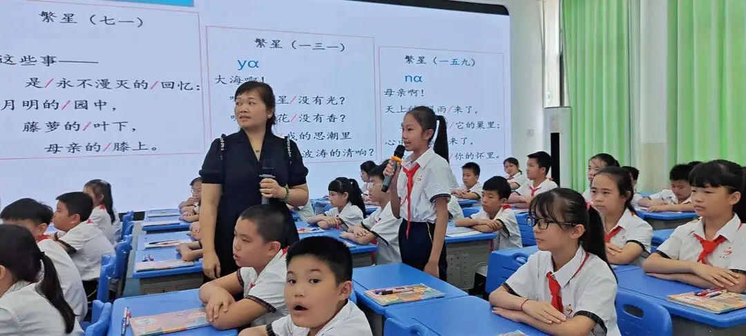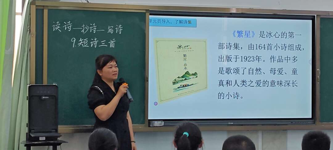 上课伊始,张老师先带领孩子们整体了解本单元的学习内容,明确了本单元的学习任务和目标:读诗——抄诗——写诗。接着以各种方式来读冰心《繁星》,张老师非常注重学生的读,注重引导学生读出诗的韵味。然后巧妙运用导学单,小组合作学诗,把课堂还给学生,学生在合作互学中了解了现代诗的特点,并体会其所表达的感情,有效地培养了学生的合作、独立学习的能力。整堂课充分体现了协同教学的理念。