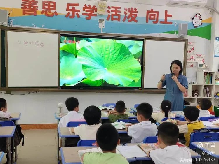 5月23日,周四上午第一节课林青云老师在一(7)班上《荷叶圆圆》第一课时,为“大比武”做准备。由于本课大部分生字都是形声字,老师采用在故事情境中随文识字,用到的识字方法有动作演示识记,以字带词的组词认读、认识偏旁识记。尝试用小组合作读、说、画丶圈写等方面学习课文第一至第三自然段。