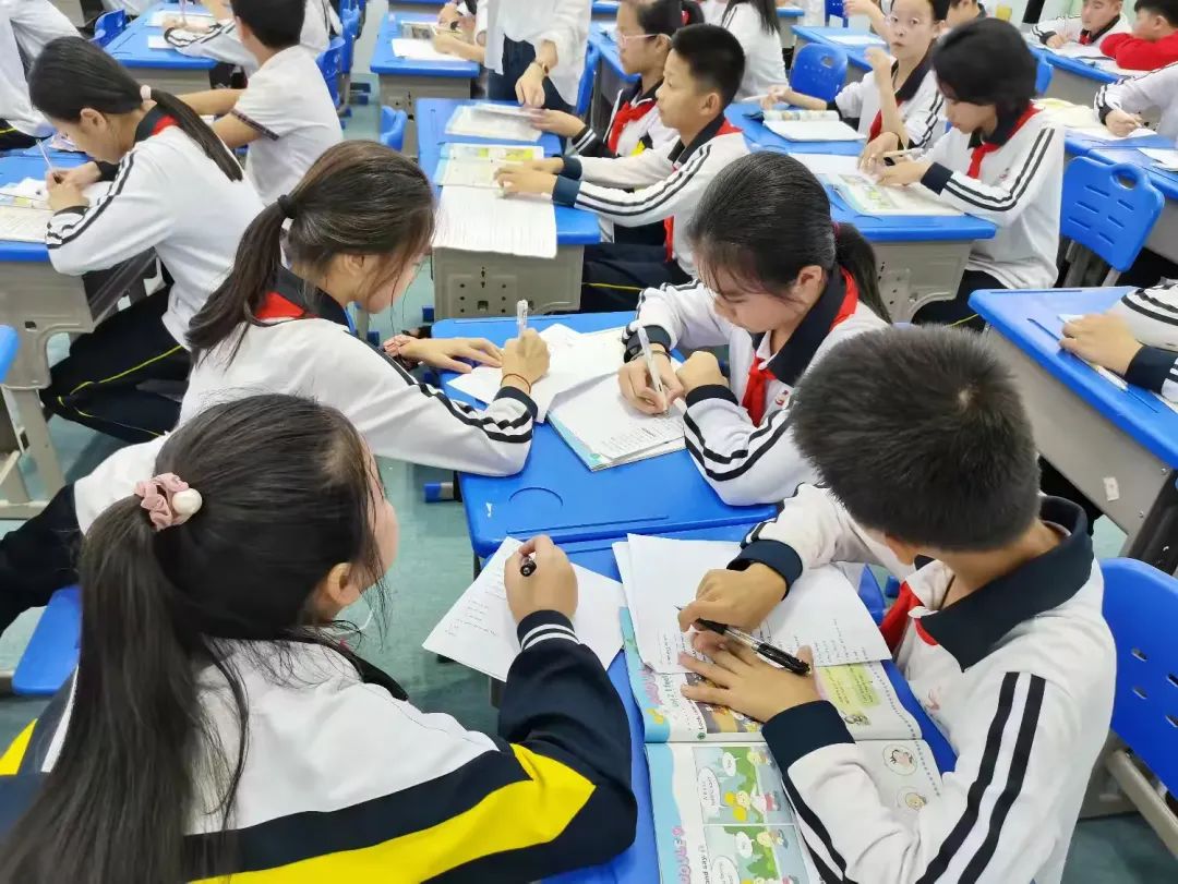 姚虹妃老师是本节课的授课教师,授课课题为五年级上册第9模块第2单元《I feel happy》。姚老师为本节课做了充分的准备,深入研究教材,精心设计一系列生动有趣的教学活动。她以歌曲进行导入热身,激起孩子们的乐趣!出示表达情绪的不同图片,引领孩子们自学后检查成果。以变脸的视频让孩子们知道川剧中不同的面具代表不同的心情。从而引出happy ,sad,angry等表达心情的单词。以小组为单位观看3个图片运用Does he/she feel ...?Yes / No, he/she doesn't How does he She feel?He / she feels ...进行对话交流,让学生在对学、群学,然后展示任务分工的情况下准备班上展示,教师对学生展示的问题进行点拨指导, 最后在达标测学中让孩子们对本课所学进行检测,检查本课的知识点是否真正的掌握,题目由易到难。