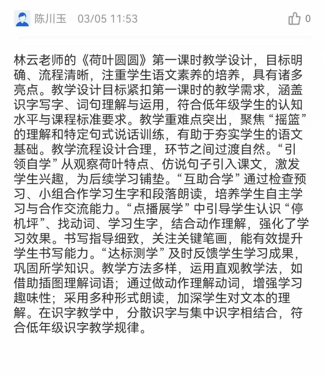 陈川玉老师结合《荷叶圆圆》授课过程进行课例分析。在分析中陈老师提到,授课老师凭借出色教学技巧,将孩子们带入充满生机的荷塘世界。从教学目标看,紧扣一年级学生认知水平,聚焦识字、朗读与初步感知文本情感,定位精准。课堂提问面向全体,引导学生观察思考,锻炼思维能力。总体而言,这堂课亮点突出,为低龄学生语文启蒙教学提供优秀范例 。