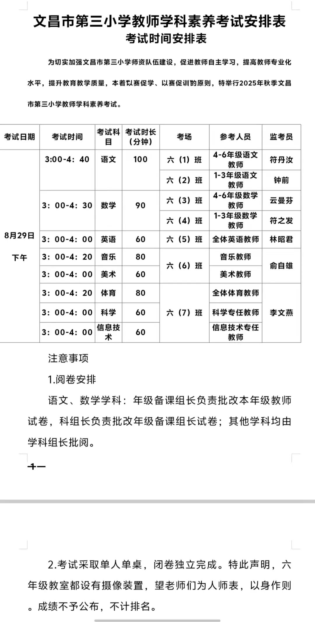 从“考学生”到“考教师”,这场学科素养考试是文昌市第三小学“师资强校战略”的缩影。对教师而言,通过“备考—应考—评考”全流程,倒逼自主学习,夯实专业根基,让“身学习”成为职业自觉;对学校而言,以标准化考务为契机,规范教学管理,强化“严谨治学”的校园文化;对未来而言,将教师专业成长转化为课堂生产力,最终赋能学生全面发展,为“办好人民满意的教育”筑牢基石。