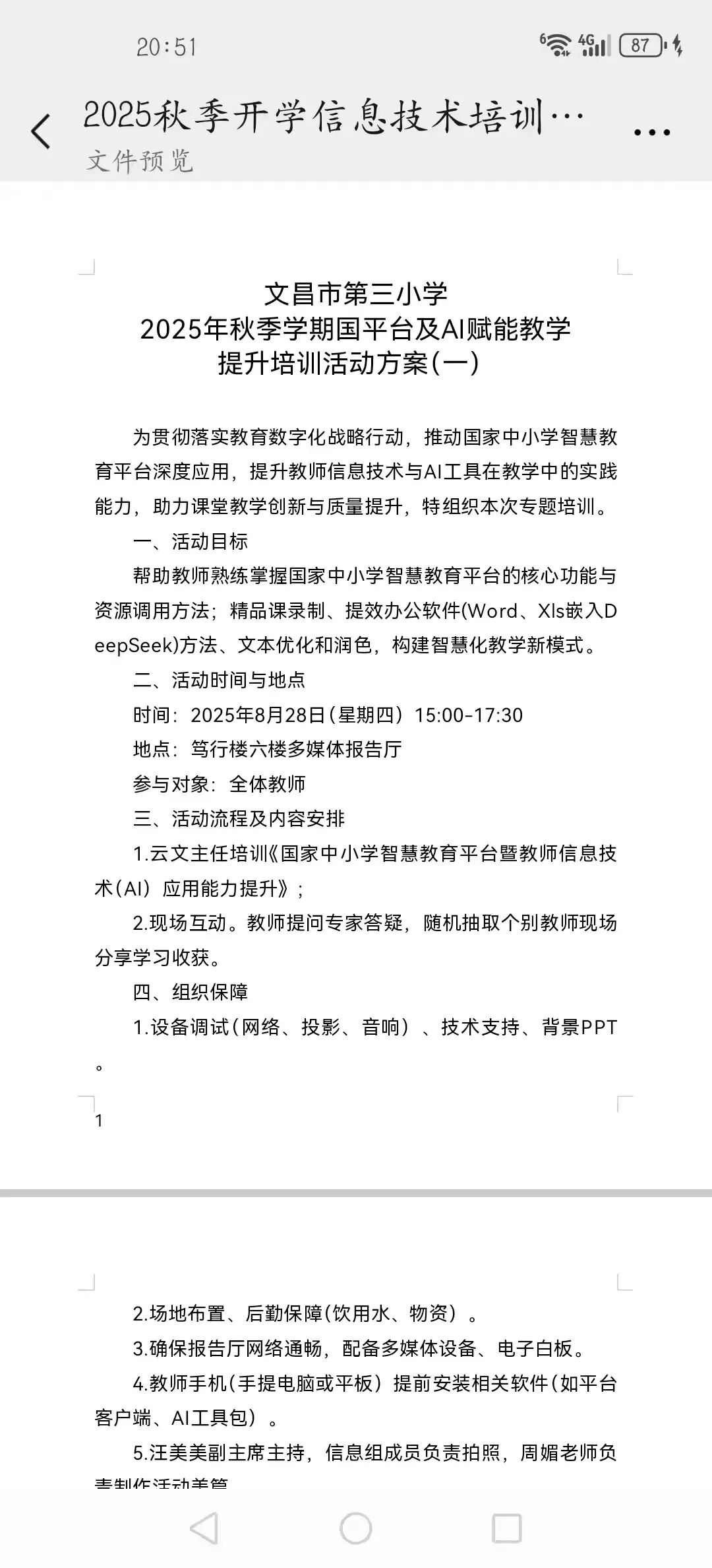 通过系统化培训,教师将实现"三个提升":教学资源制作效率显著提升,平均节省课件准备时间50%以上;数字化资源整合能力全面提升,教师能独立完成跨平台素材整合;AI工具应用水平有效提升,形成"技术减负、课堂增效"的良性教学循环。培训成果将通过新学期课堂实施和备课等形式进行持续跟踪。