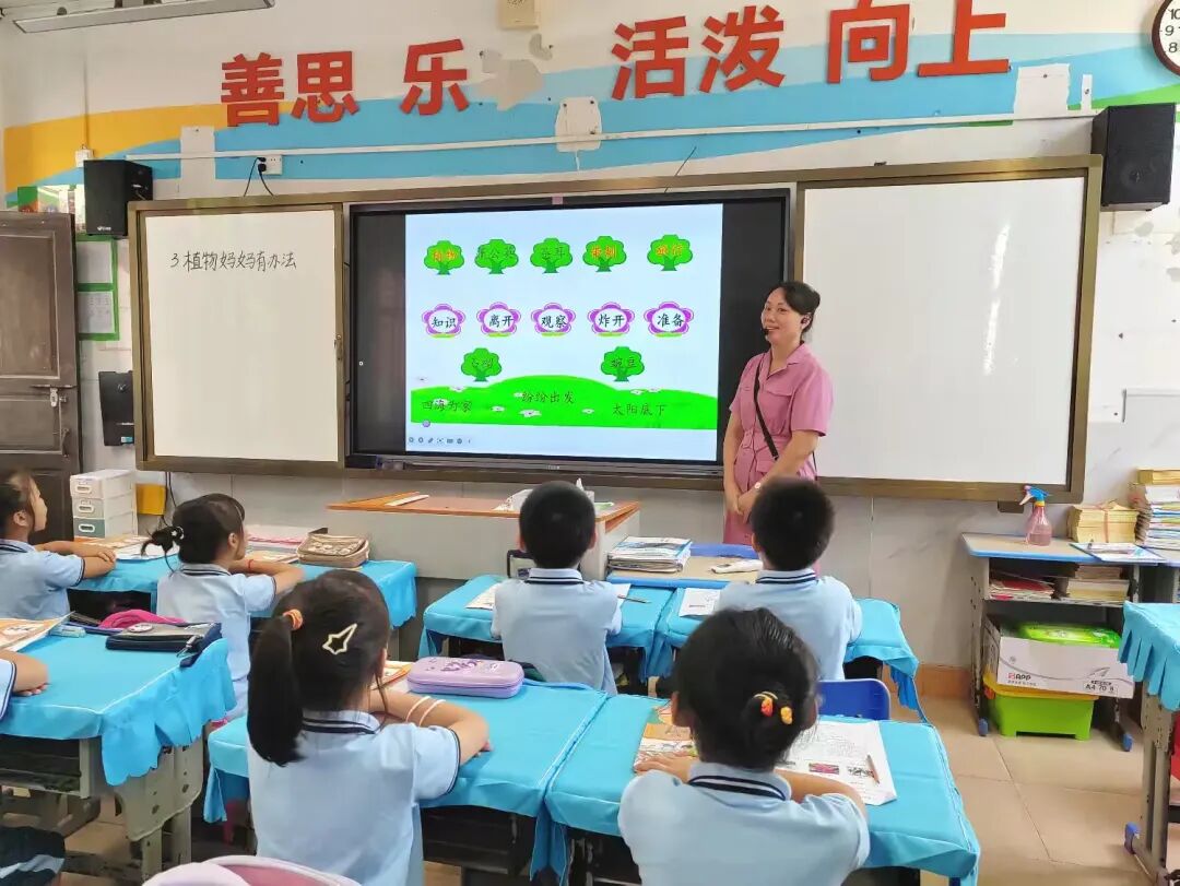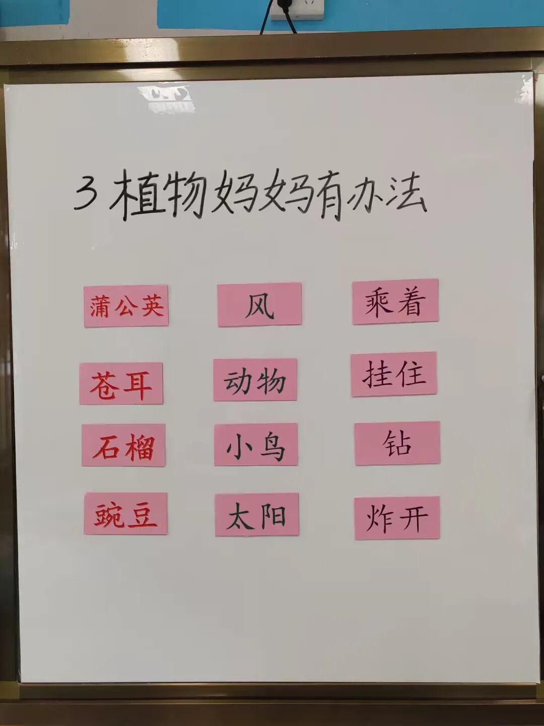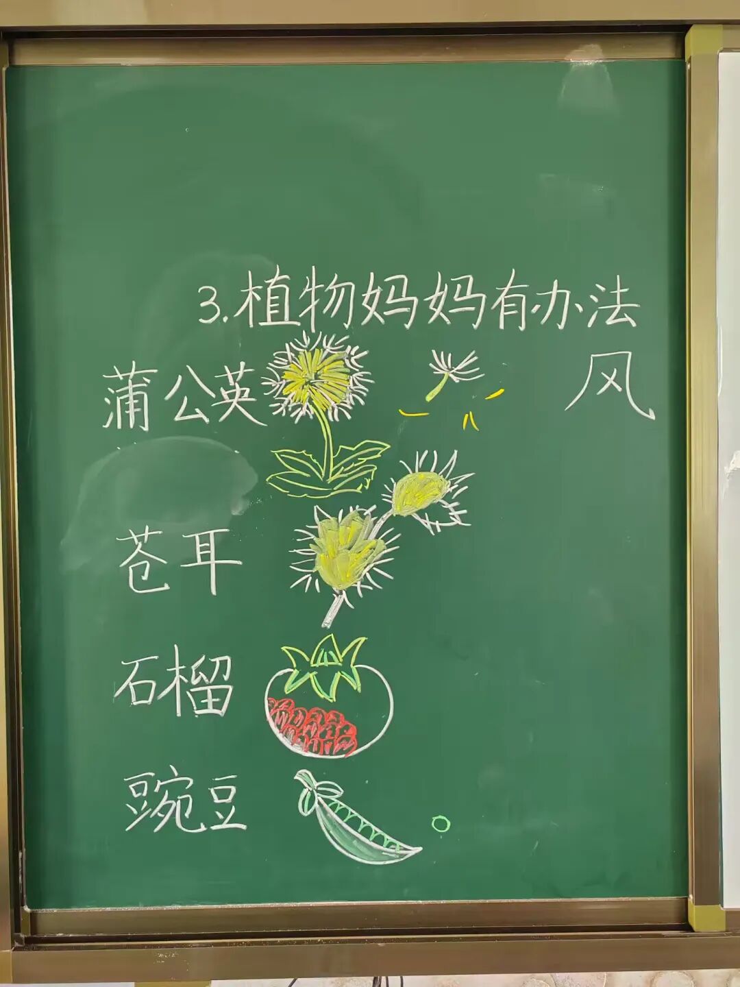 课堂上,白板展示了植物传播种子的办法,黑板上也呈现了植物相关的教学内容,帮助学生直观理解课文知识。学生们在老师的引导下,认真思考,积极发言,课堂氛围浓厚。