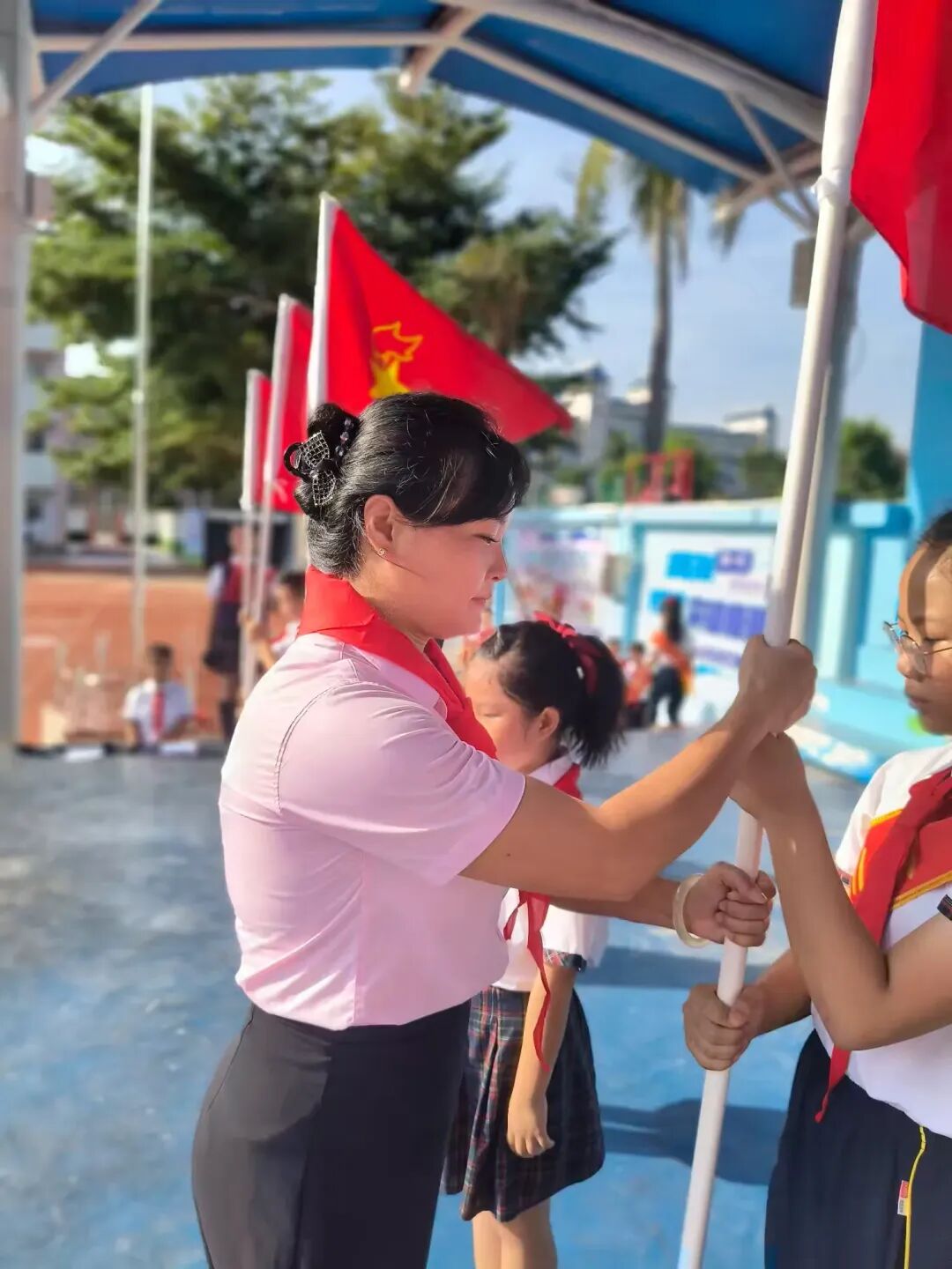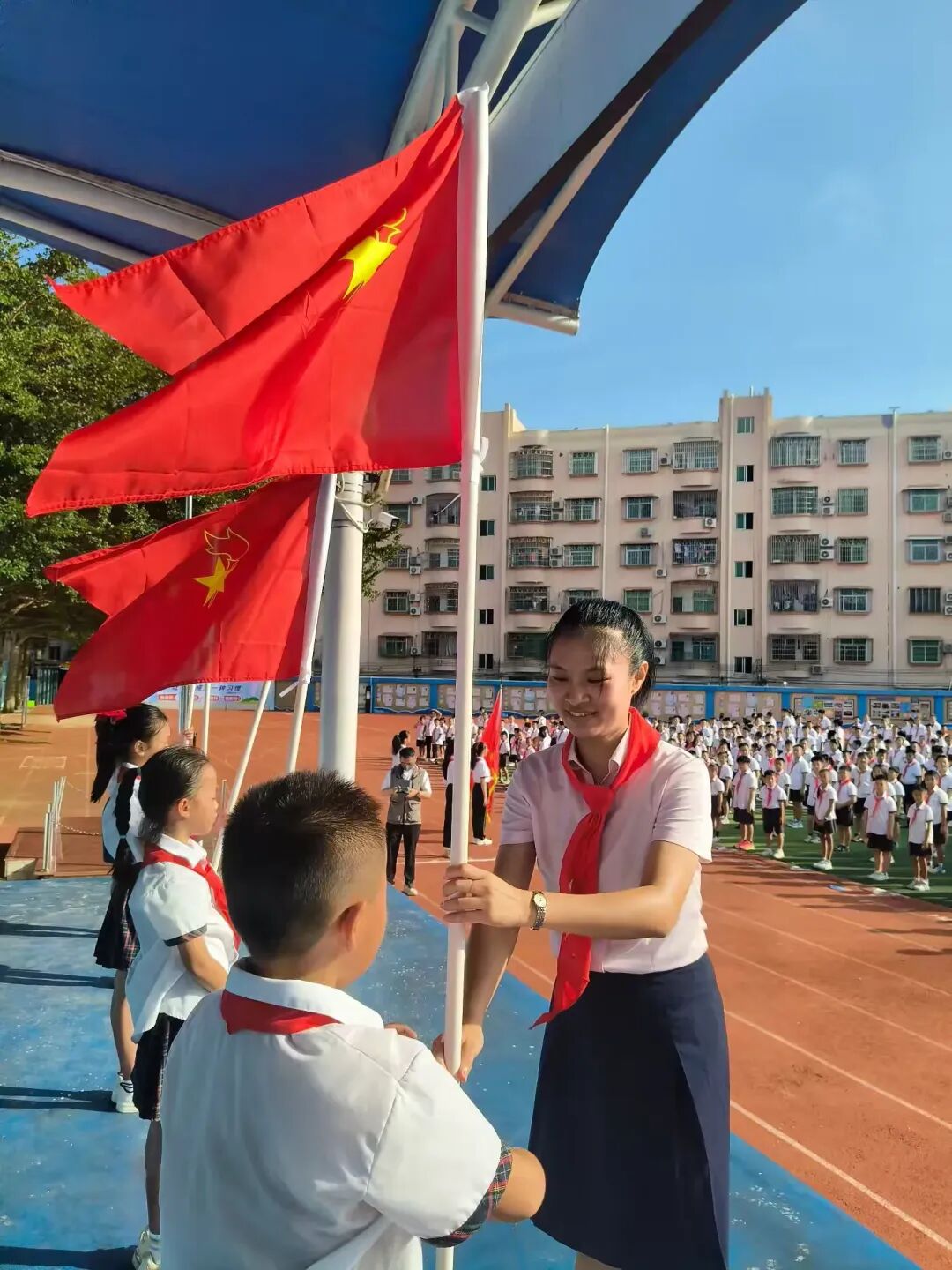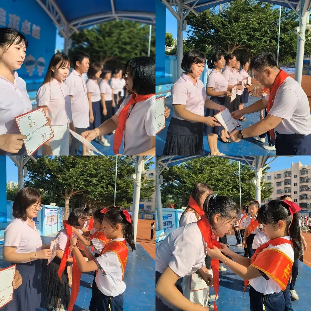 丁雅慧、陈晓欣两位副辅导员郑重为新建中队授中队旗,她们的手与队员的手在旗杆上交汇,红色的队旗在阳光下猎猎作响。新建中队的队员们身着整齐校服,紧握队旗,眼神坚定,这一面面队旗既是荣誉的象征,更是责任的传递,从辅导员手中到队员肩头,完成了一场关于少先队精神的接力。