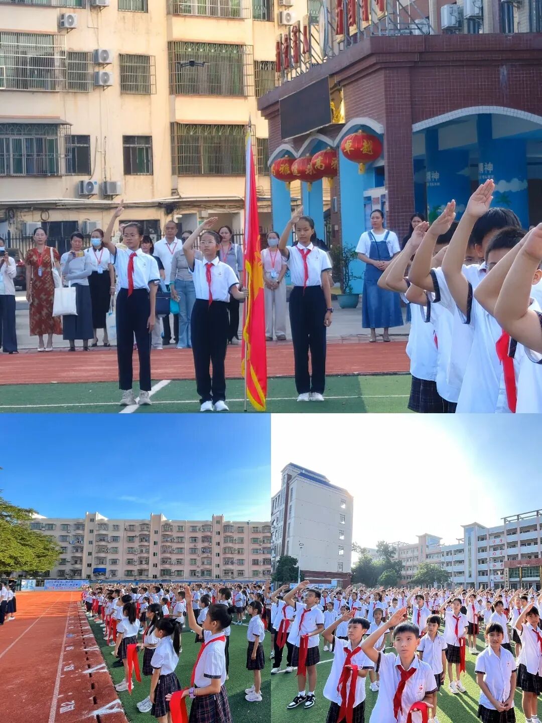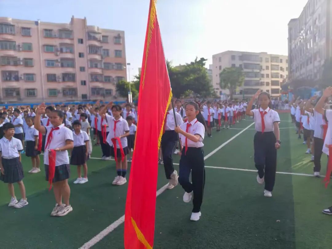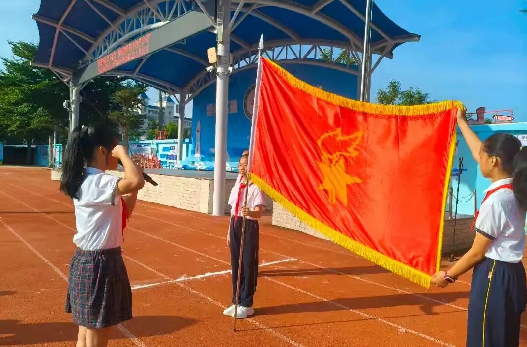 在校园的绿茵场上,旗手们迈着坚定的步伐护送队旗前行。奏起激昂的出旗曲,全体少先队员整齐敬礼,目光追随着那抹鲜红,直至旗手庄严就位。这一刻,队旗飘扬,信念闪耀,是少年们对组织的赤诚敬意,更是他们传承使命的生动开篇。