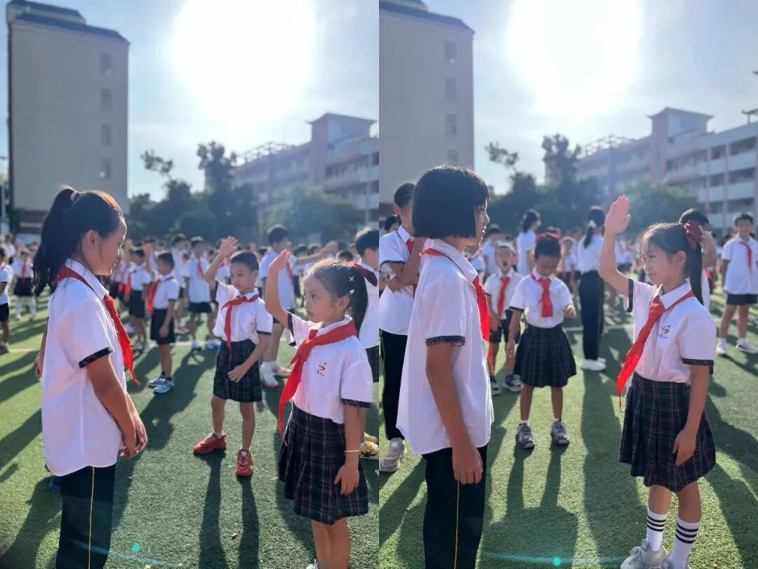 五年级的老队员们怀着庄重的心情,将提前准备好的红领巾为二年级新队员规范佩戴。每一个动作都严肃认真,红领巾在胸前飘扬成信仰的模样。授巾完毕,老队员与新队员互相敬礼,这一敬,是传承的承诺,是少年们对少先队精神的赤诚践行。