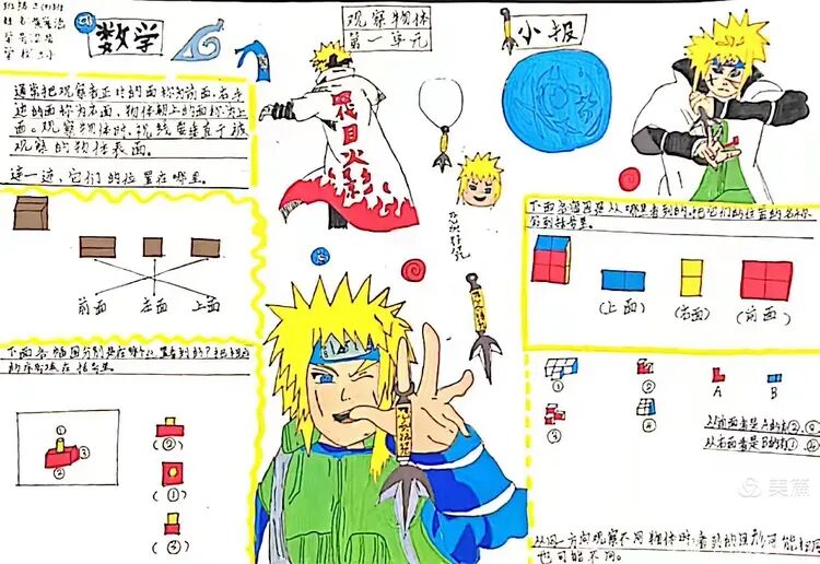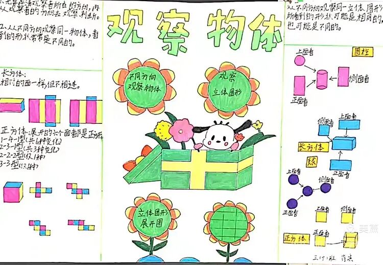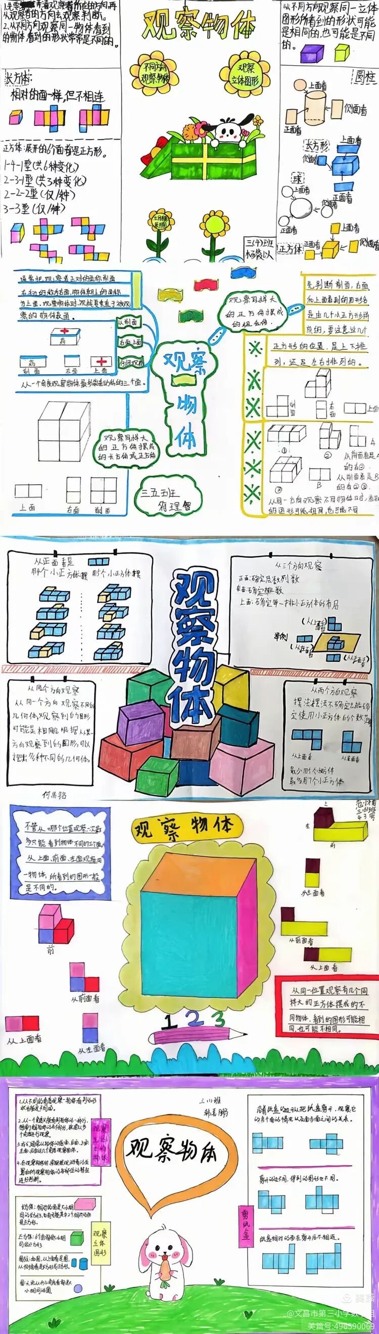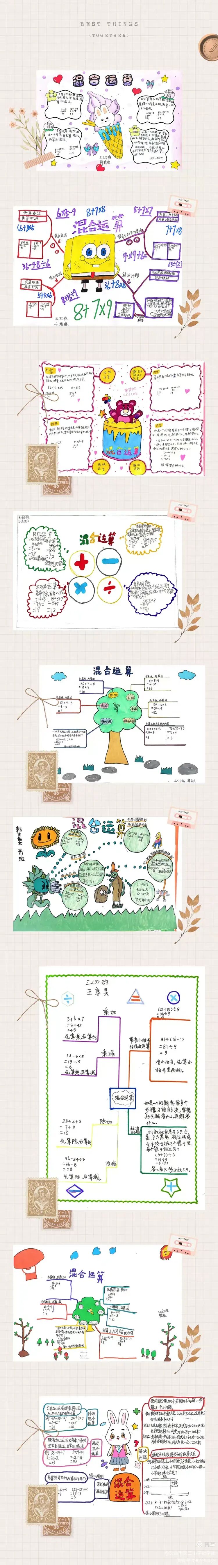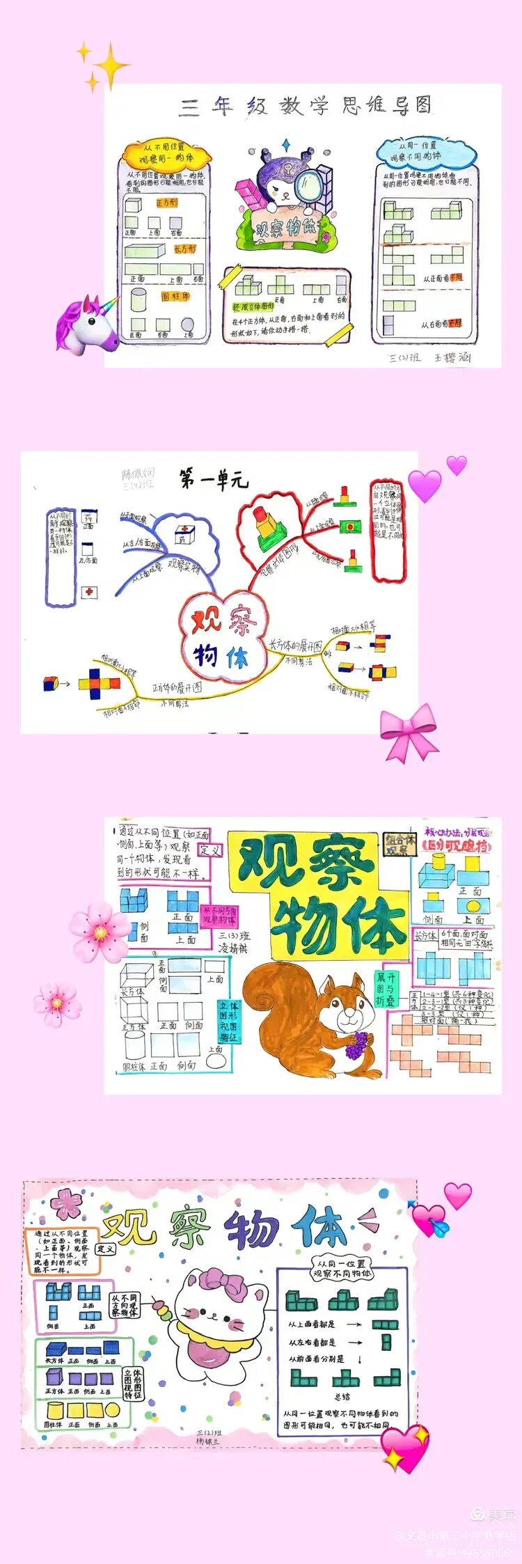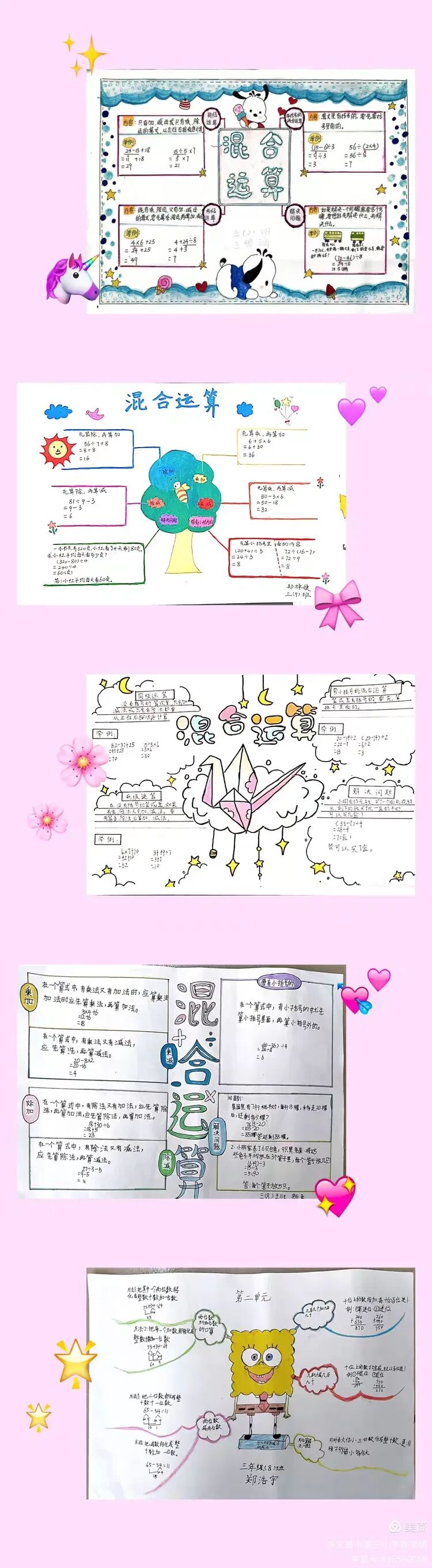 聚焦“观察物体”与“混合运算”两大单元,三年级的思维导图以生活为起点,以童心绘逻辑。通过“小正方体观察示意图”展现多角度空间感知,借“运算顺序红绿灯”形象演绎同级与两级运算规则。知识在趣味中串联,思维在条理中萌芽,一幅幅作品如初春新叶,焕发着数学启蒙的清新活力。