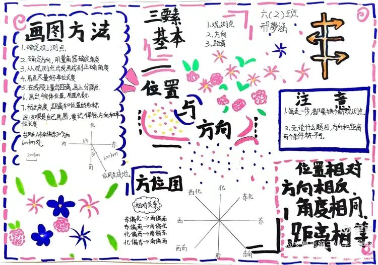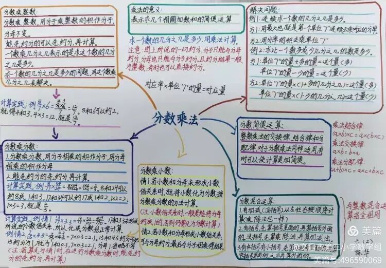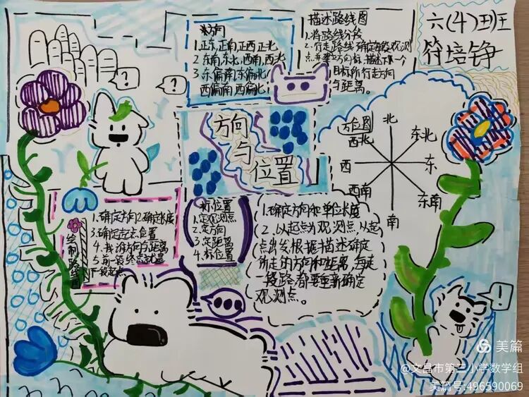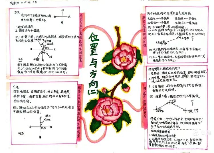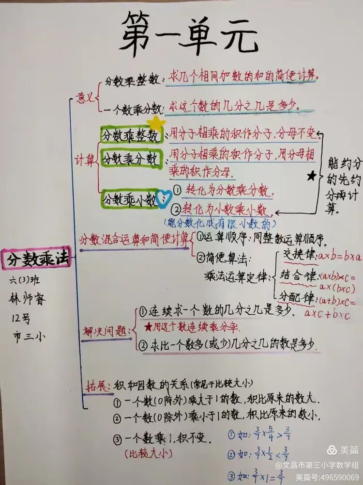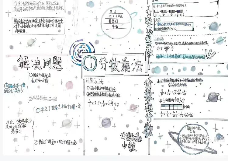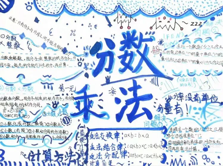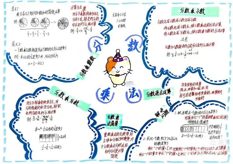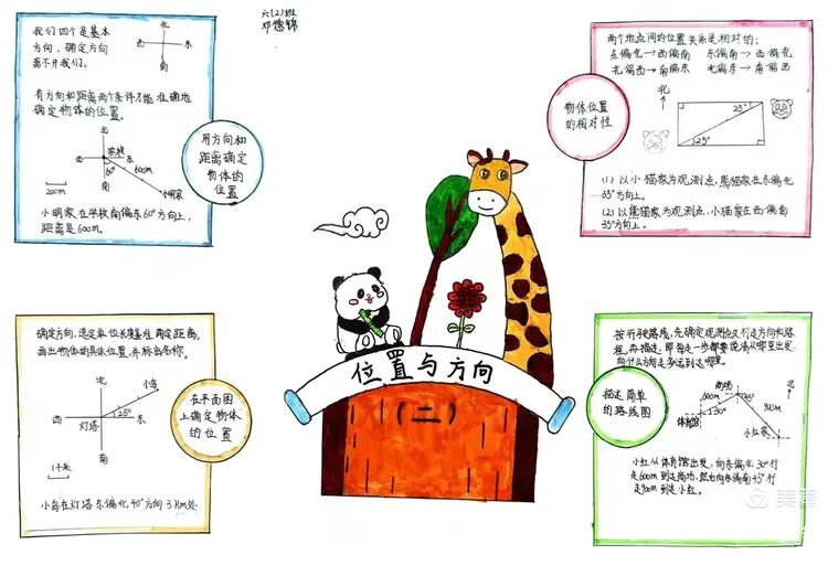 聚焦“分数乘法”与“位置与方向(二)”,六年级作品展现出高度整合的思维格局。以“分数乘法的意义”为原点,辐射出计算法则、简便运算与实际应用的知识网络;方向部分则融合“方向、角度、距离”三要素,辅以“路线图示意图”,完整呈现位置描述的逻辑闭环。知识不再是零散的点,而是织成一张缜密而灵动的思维之网。