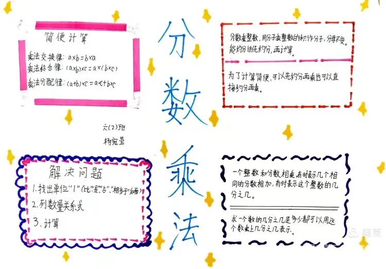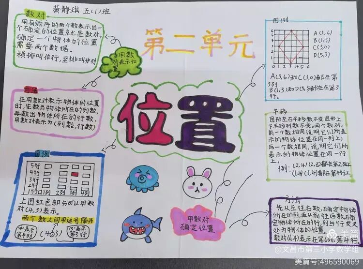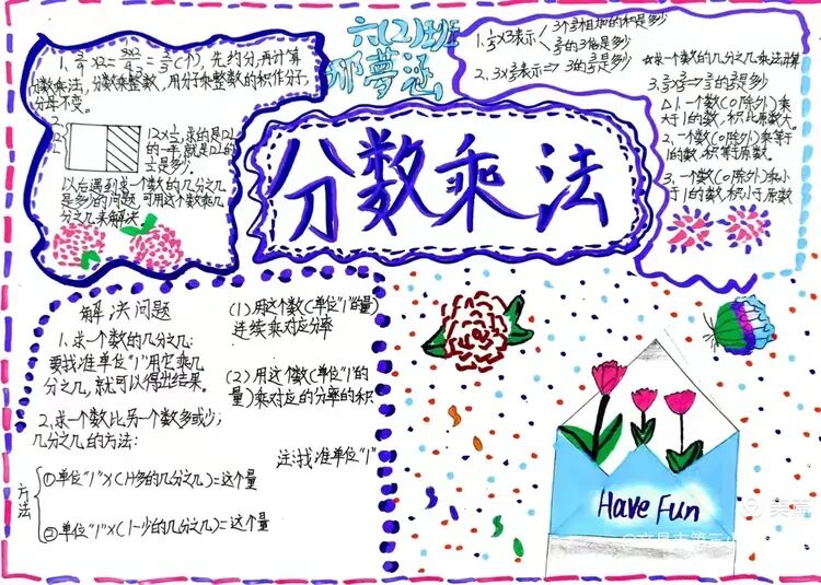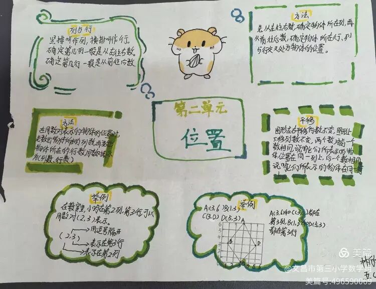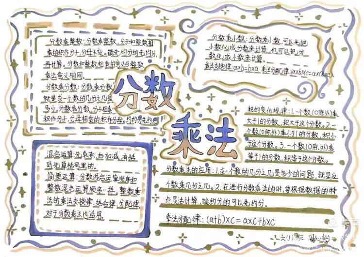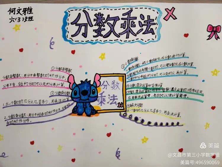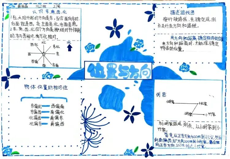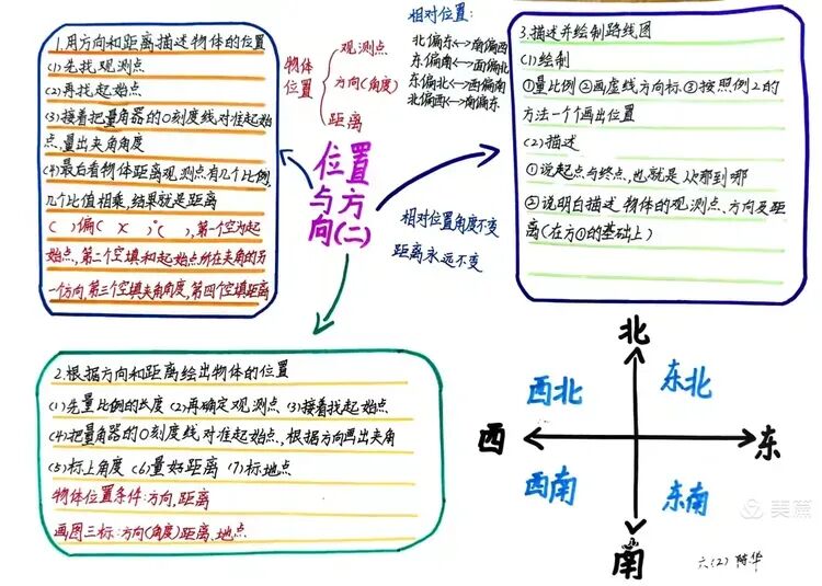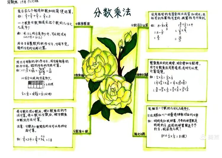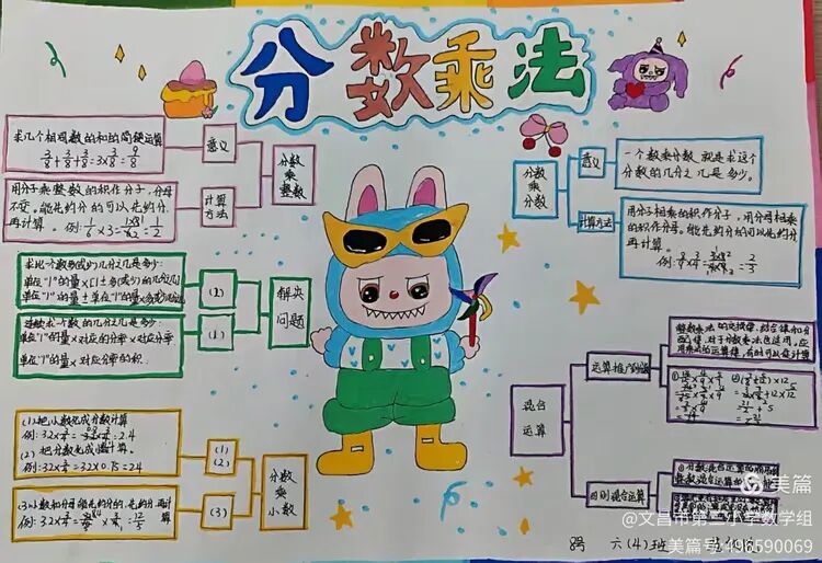聚焦“分数乘法”与“位置与方向(二)”,六年级作品展现出高度整合的思维格局。以“分数乘法的意义”为原点,辐射出计算法则、简便运算与实际应用的知识网络;方向部分则融合“方向、角度、距离”三要素,辅以“路线图示意图”,完整呈现位置描述的逻辑闭环。知识不再是零散的点,而是织成一张缜密而灵动的思维之网。