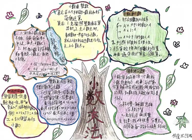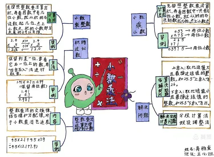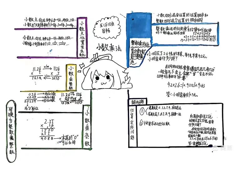 围绕“小数乘法”与“位置”两大主题,五年级的导图彰显理性之美。以“小数乘法→转化整数→确定小数点”为链条,步步推导算理本质;依托“方格纸坐标图”,结合教室座位、地图定位等实例,生动诠释数对的应用场景。抽象概念在逻辑拆解中落地生根,思维深度在实践融合中不断延展。