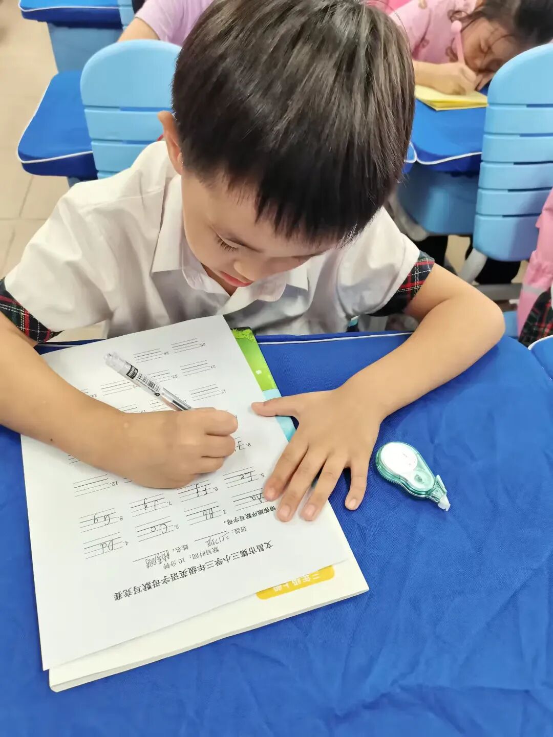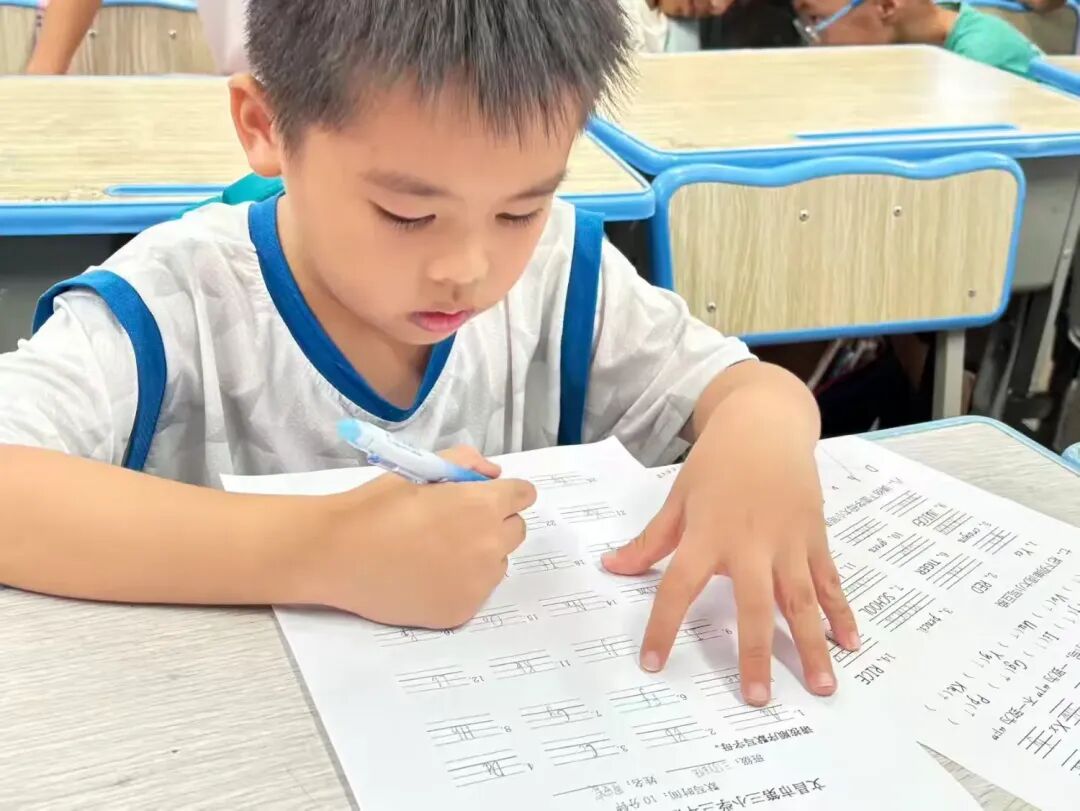 孩子们眉头微蹙,身体前倾,目光紧盯纸面,右手紧握铅笔,专注于笔画顺序与位置分布,仔细完成每一个字母的书写,展现出良好的书写习惯。