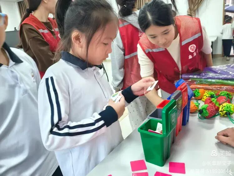 完成制作后,大家走进社区角落,亲手将标识牌固定在树下、墙边,高度恰好是孩子的视线——90厘米,正是“一米视角”的温柔体现。这一刻,教育走出课堂,融入街巷肌理。而后的垃圾分类加时赛,则让环保理念在游戏中扎根。四色垃圾桶整齐排列,孩子们抽卡分类,边玩边学。