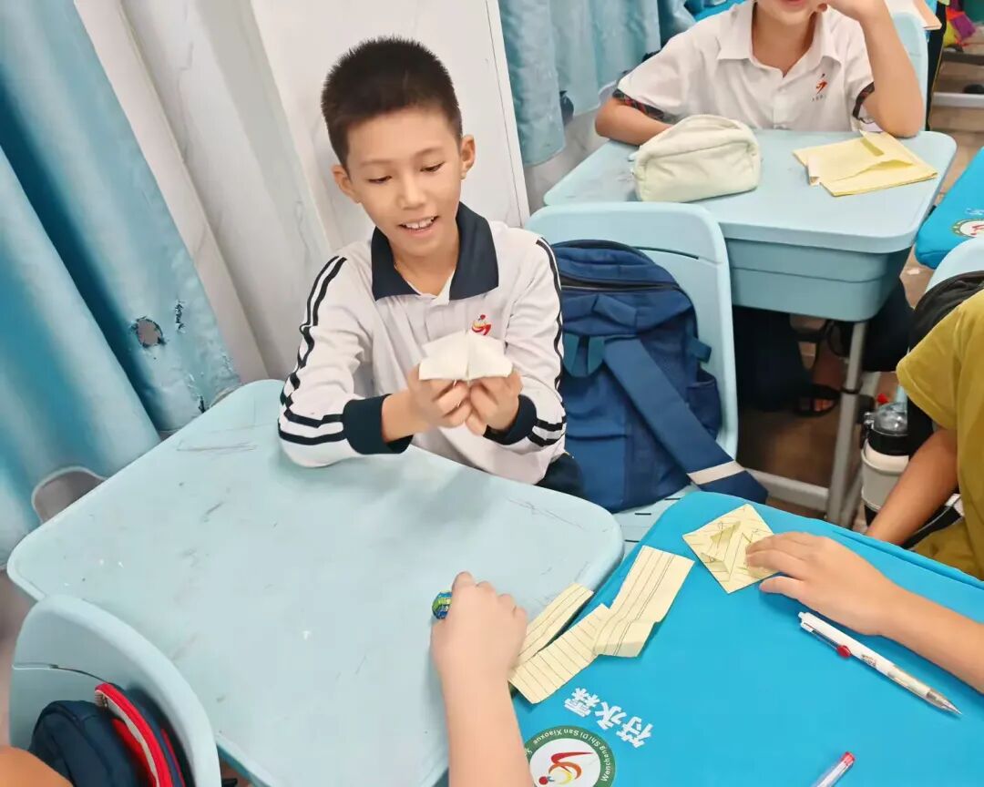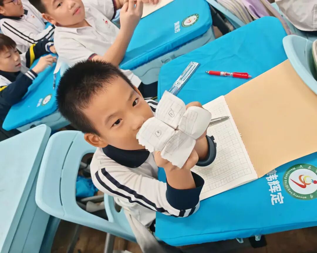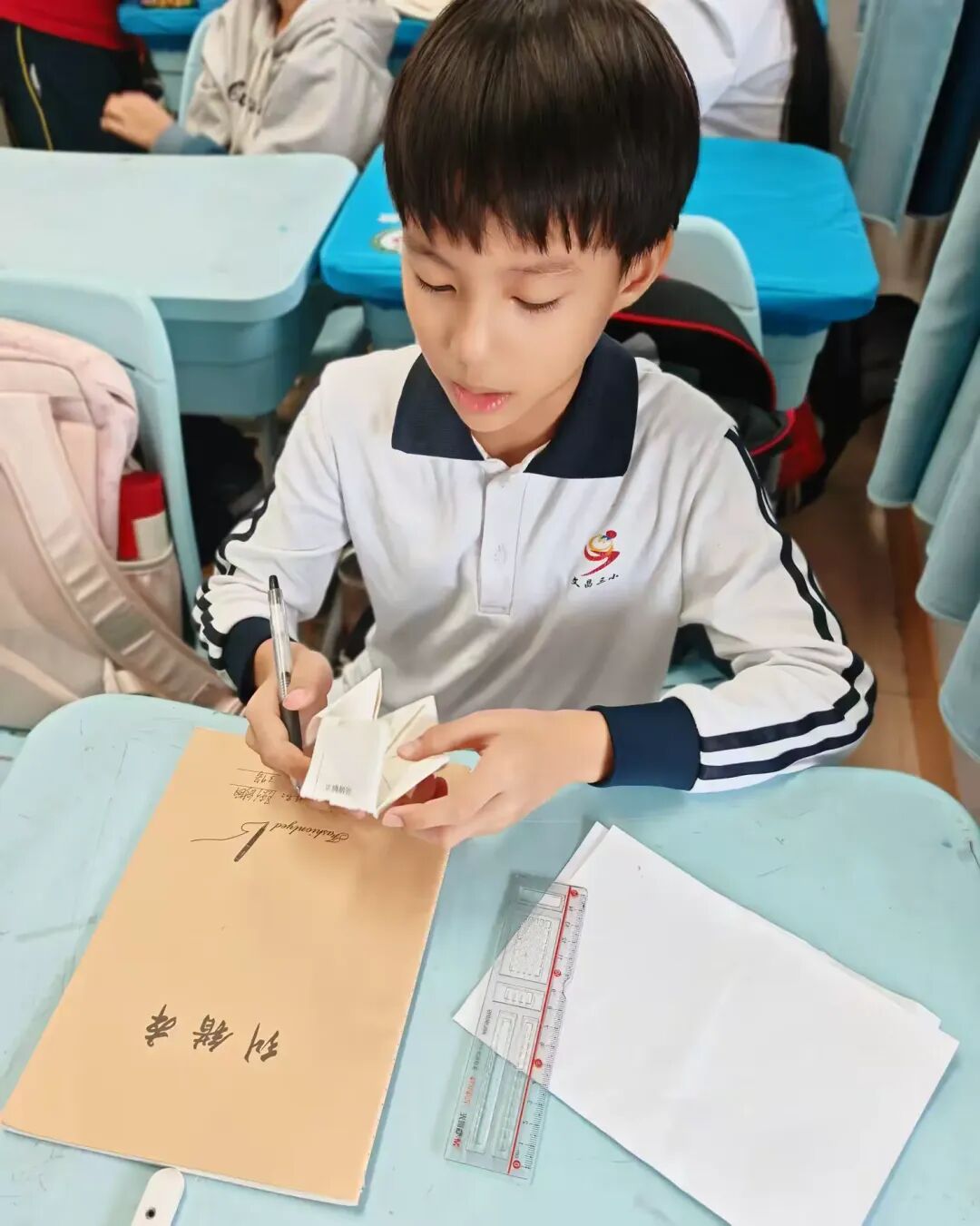 一片沸腾之后,一个用纸折成的“东南西北”一出场,又吸引了孩子的目光。孩子们迫不及待地动手,在家长的引导下,一步一步折出自己的“愿望”,简单的创意,带来了无限的快乐。
