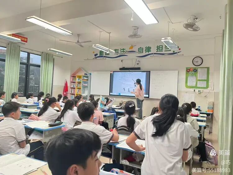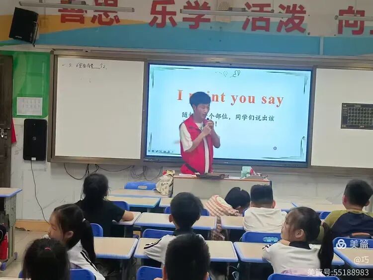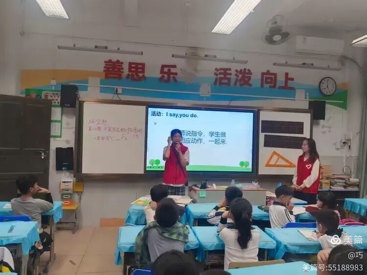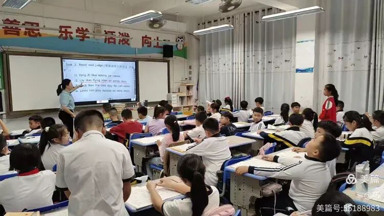 9个班老师准时到班管理纪律,自贸港英语课1~9班先学习英文歌曲,上课口令。再授课,内容为“go away,big green monster”。整个年级上课老师精神饱满,学生学习状态好,边学边唱边做动作。