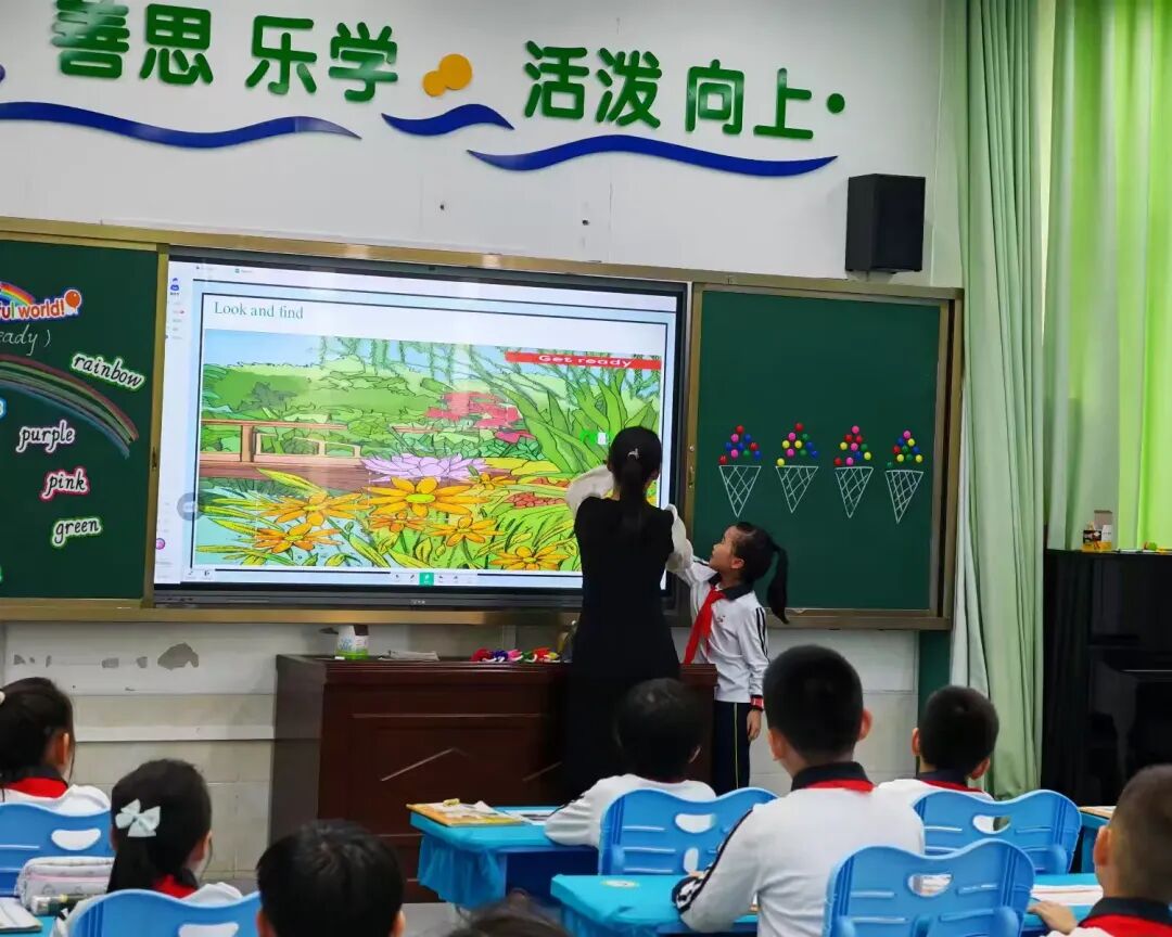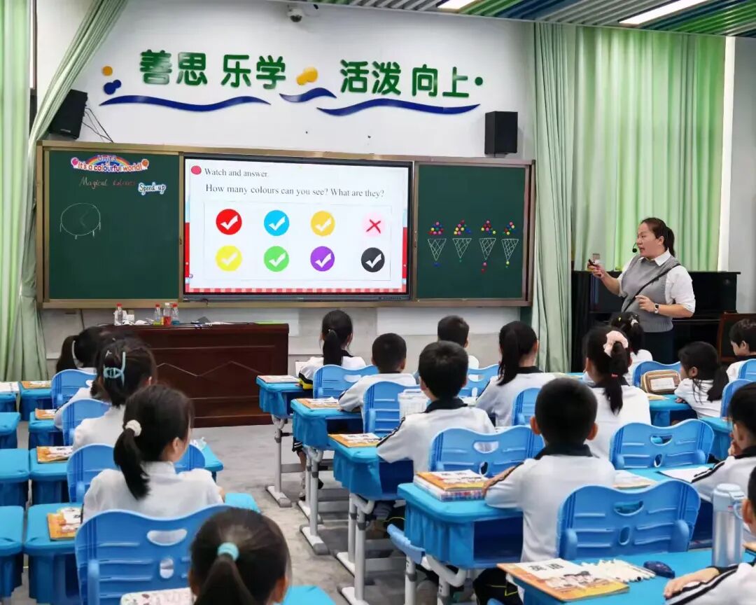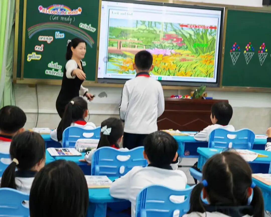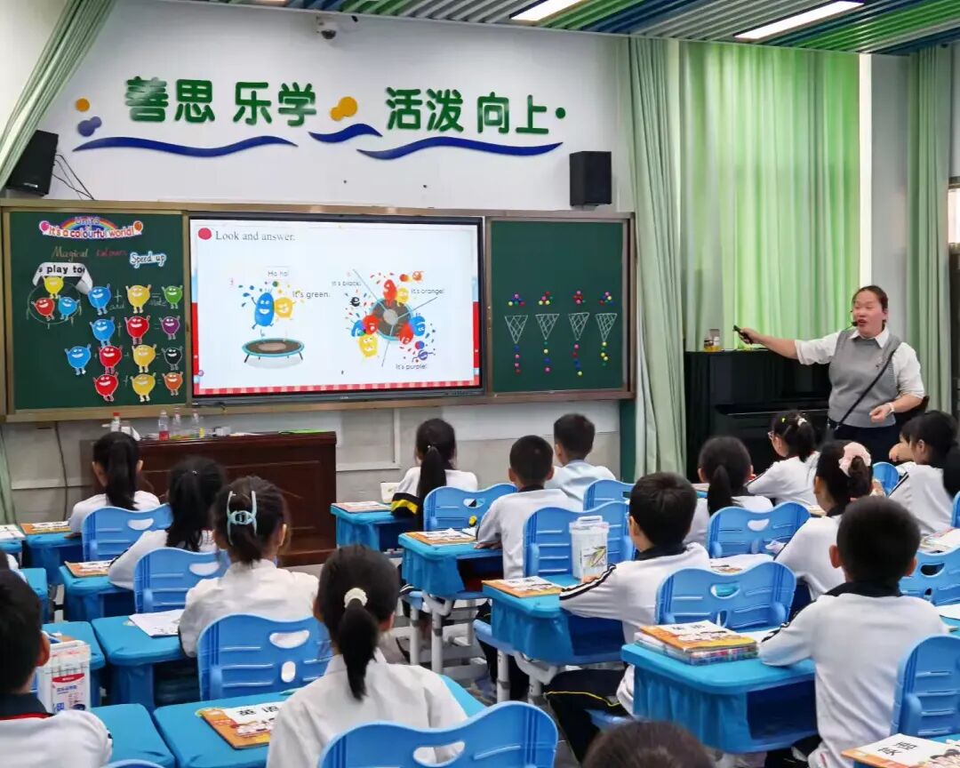 英语课堂上,教师通过多样化的互动方式引导学生参与学习。教师带领小学生进行英语活动,通过提问、游戏等形式激发学生的学习兴趣。学生们积极回应,课堂氛围活跃,展现出良好的参与状态。