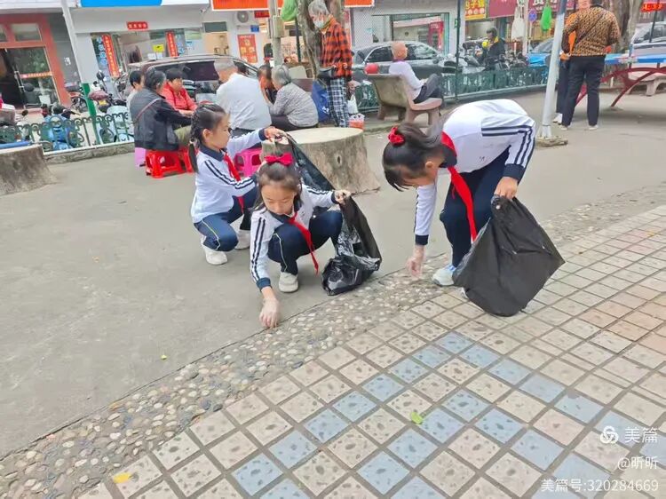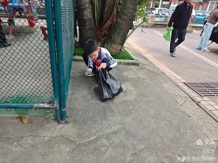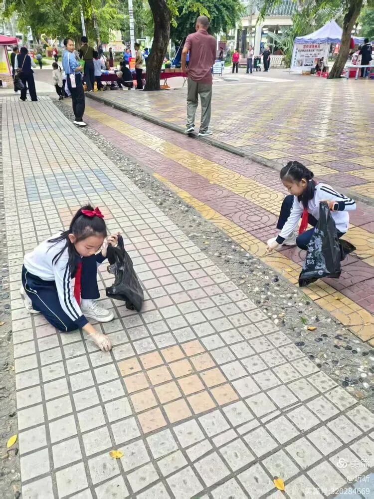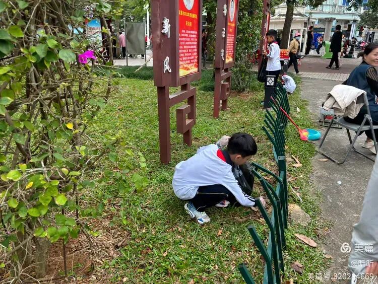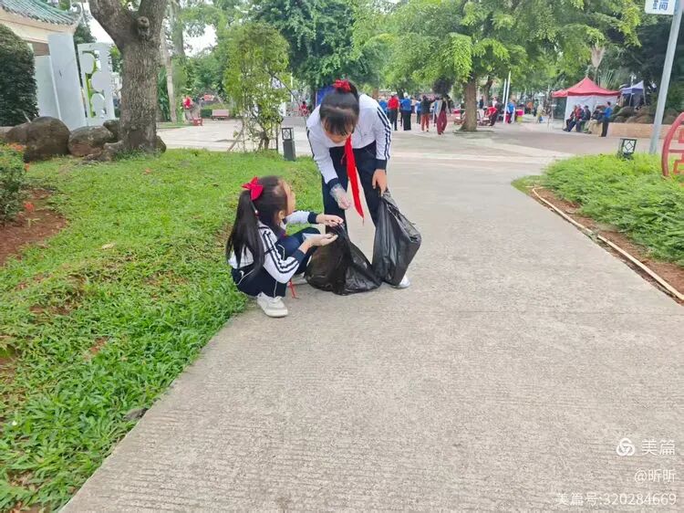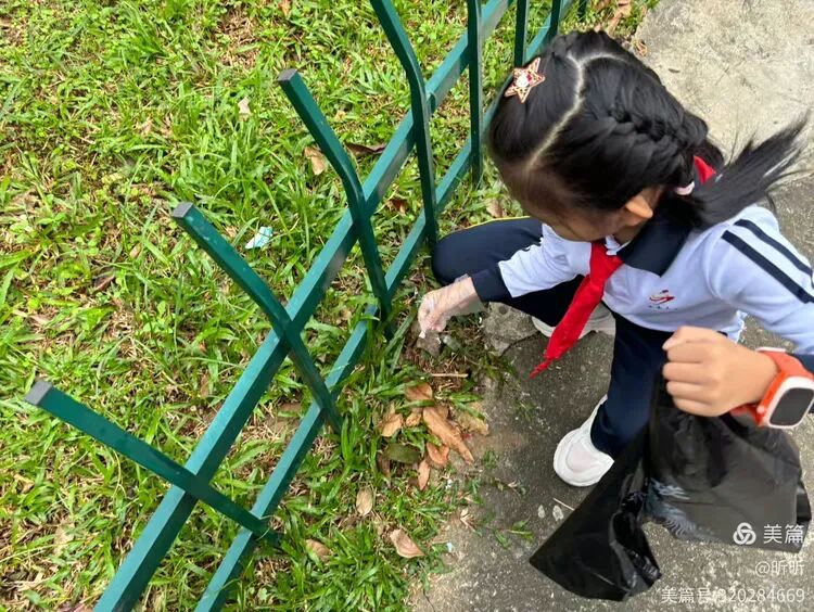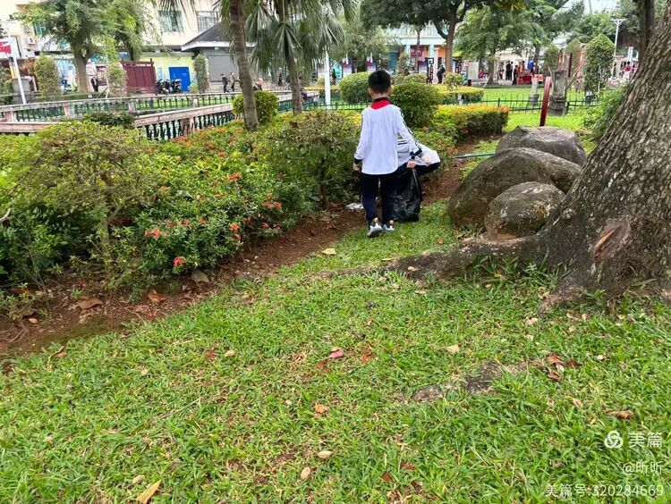 无论是在步道旁还是花丛边,同学们都仔细清理垃圾,用实际行动践行环保,展现了小小志愿者的担当。