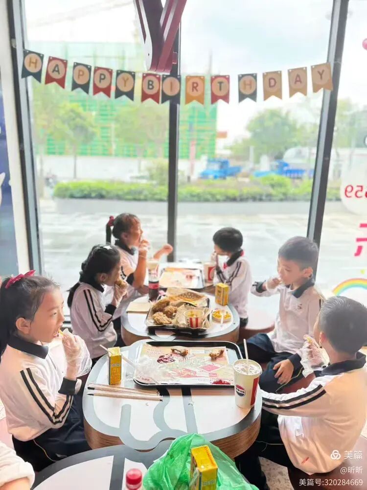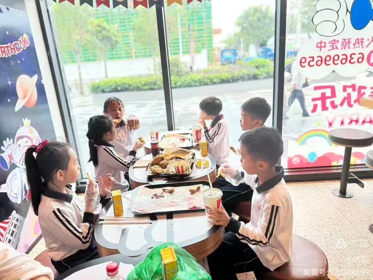 志愿者活动后,同学们在餐厅里开心用餐,分享着劳动后的喜悦,脸上洋溢着满足的笑容。