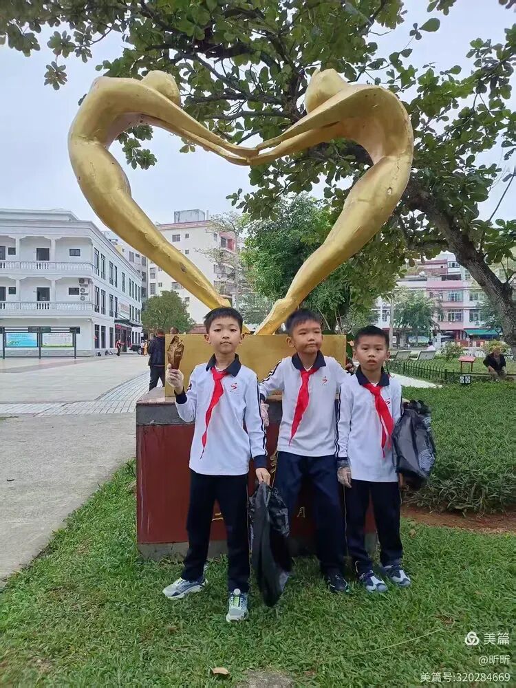 同学们在文昌公园的雕塑前合影留念,记录下这次有意义的志愿者活动,每个人都神采奕奕。