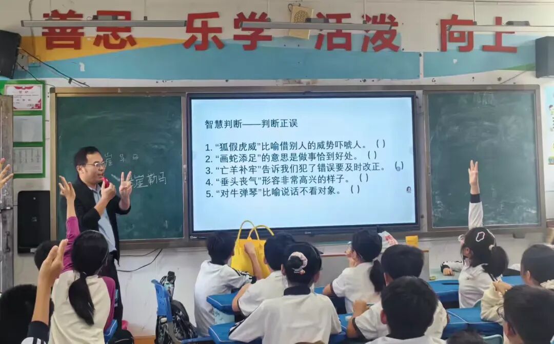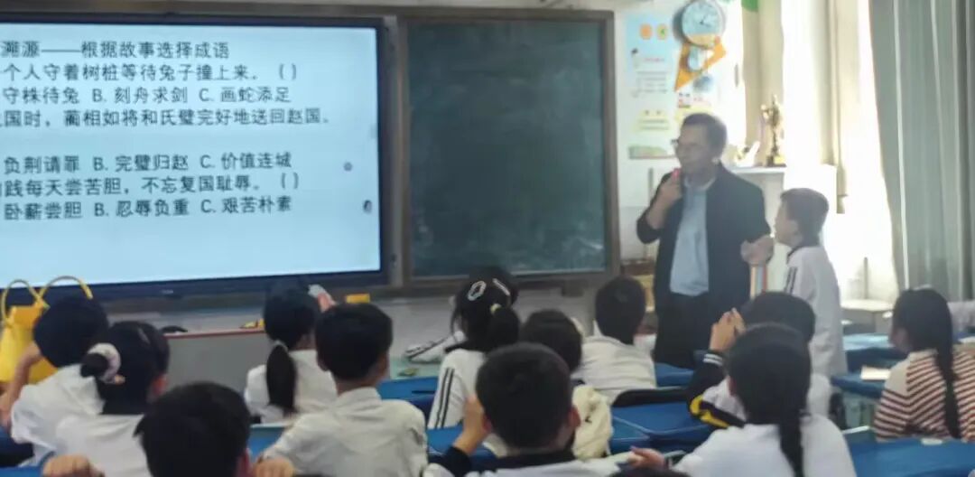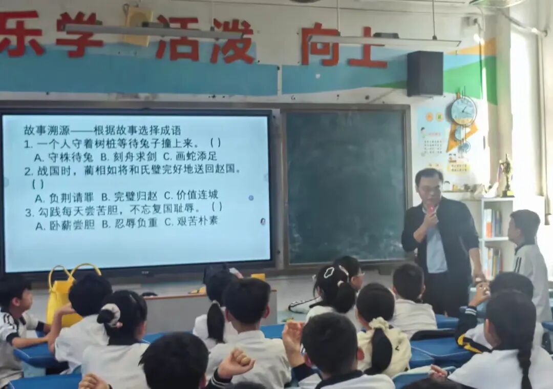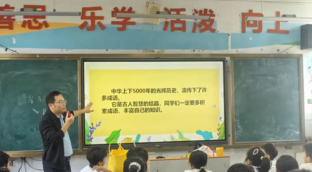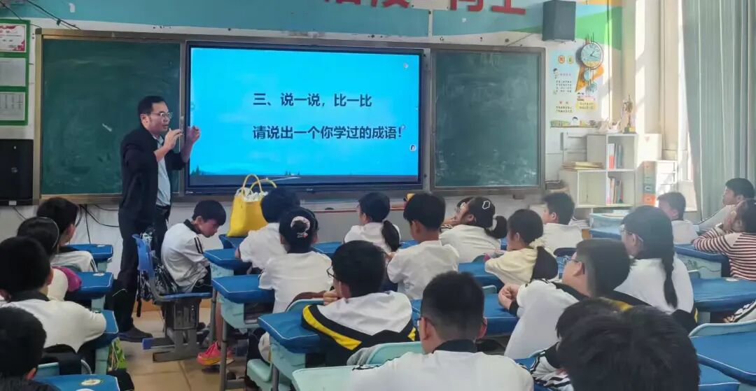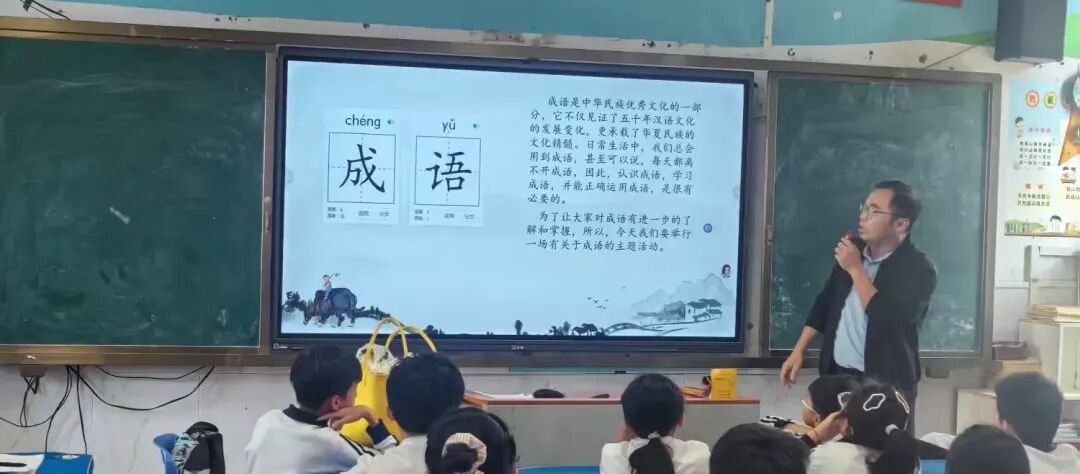 师生互动频繁,课堂气氛轻松热烈。通过问答、小组讨论等形式,学生们积极参与,充分展现了对成语学习的热情,整个教室充满了浓厚的学习氛围。