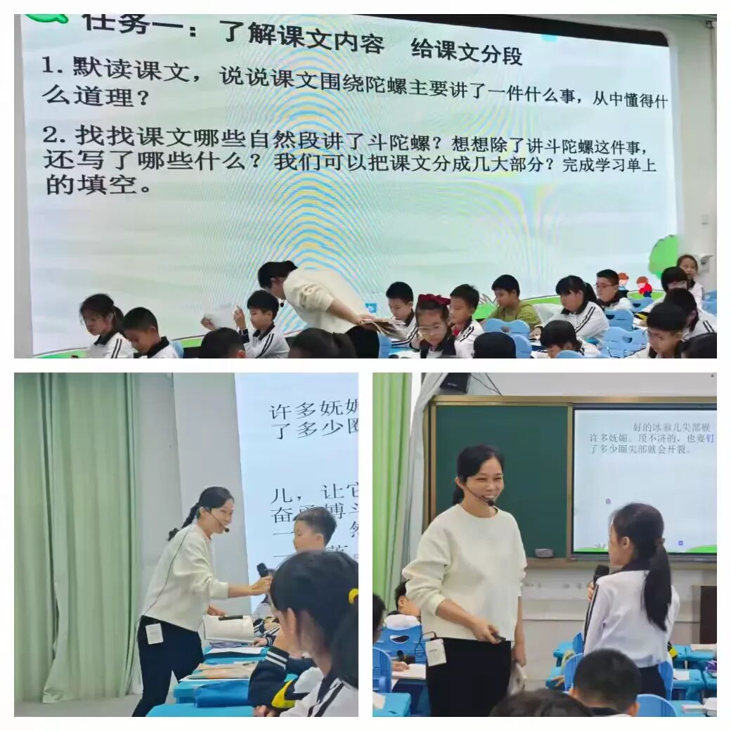 2.朗读指导扎实有效:针对四年级学生特点,教师采用“指名读+分组读+情境读”的方式,聚焦“我的陀螺刚一露面,就招来了一顿嘲笑”“这真是个辉煌的时刻”等关键语句,通过提示语气、语速的变化,让学生在朗读中代入情感,加深对文本的理解,实现了“读悟结合”。