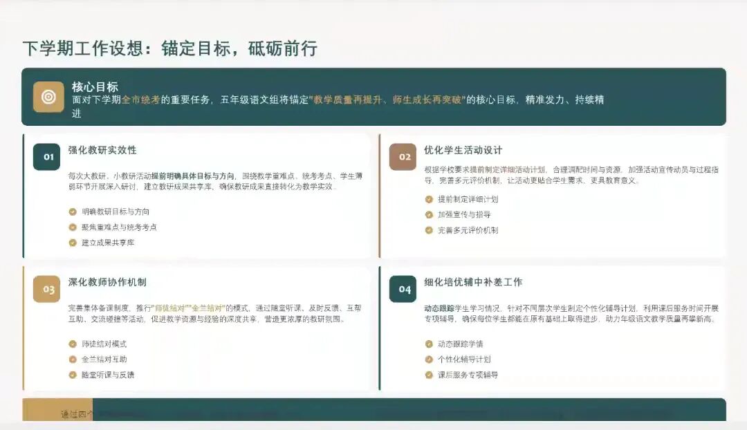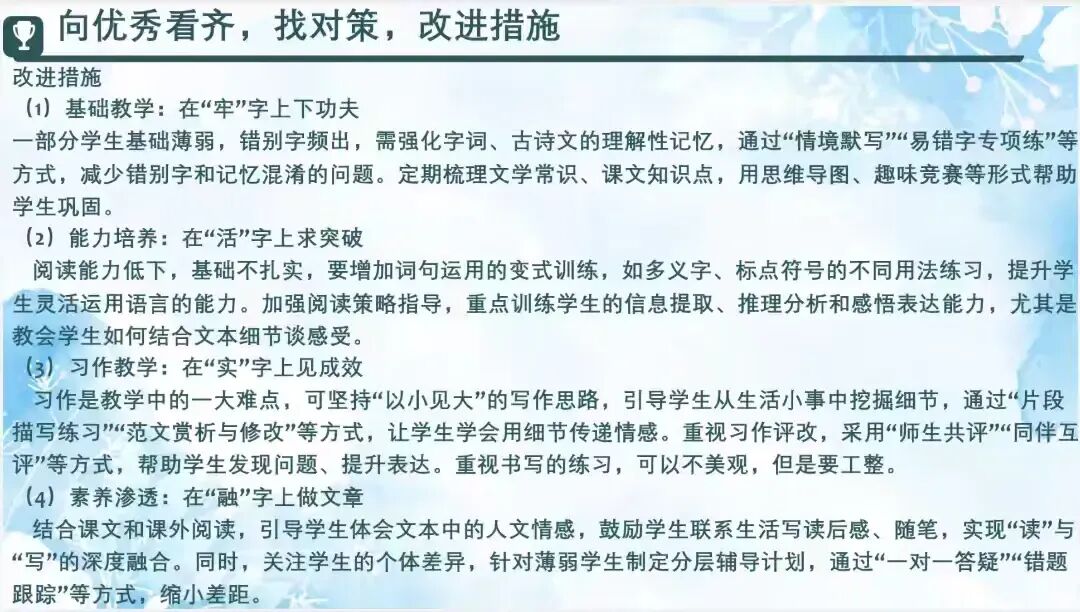 教育之路,道阻且长。本次教研总结暨质量分析会,不仅是对过去一学期的复盘沉淀,更是新征程的扬帆启航。我校语文组将继续以课堂为阵地,以教研为双翼,带着今天的收获与思考,在语文教育的沃土上深耕不辍,共赴一场温暖的成长之约。