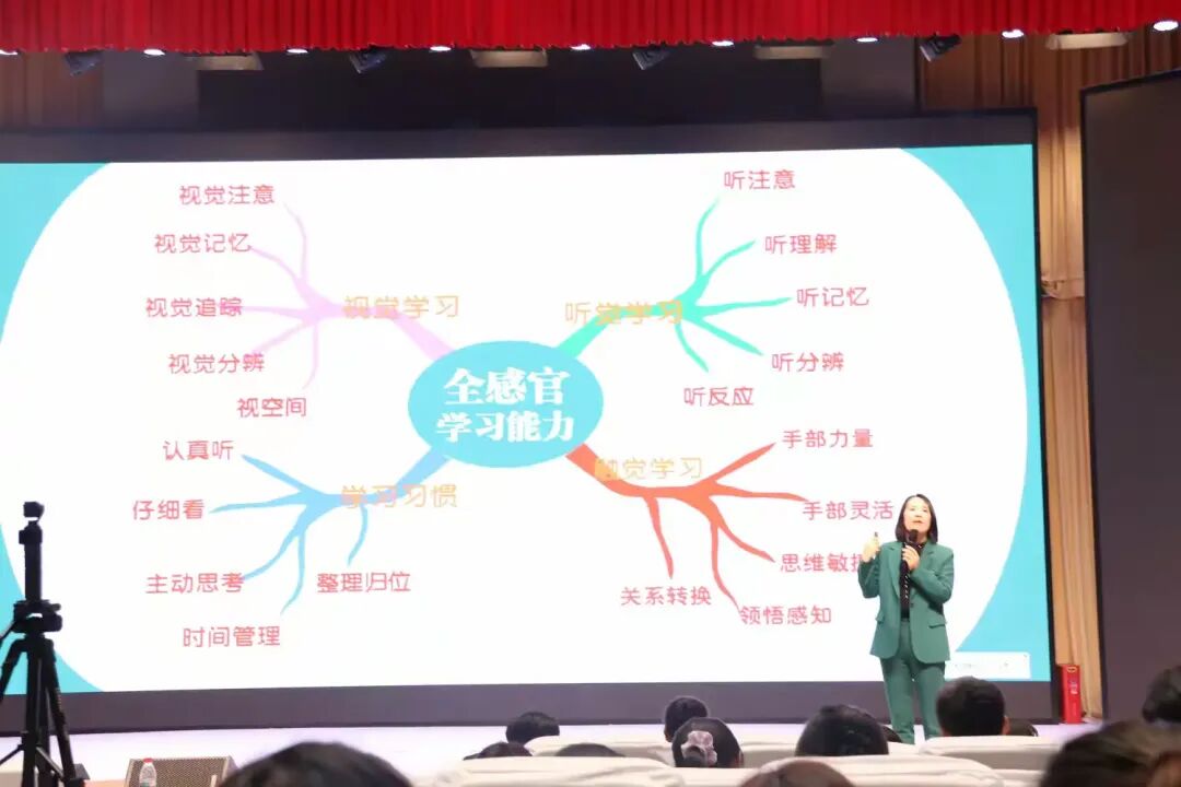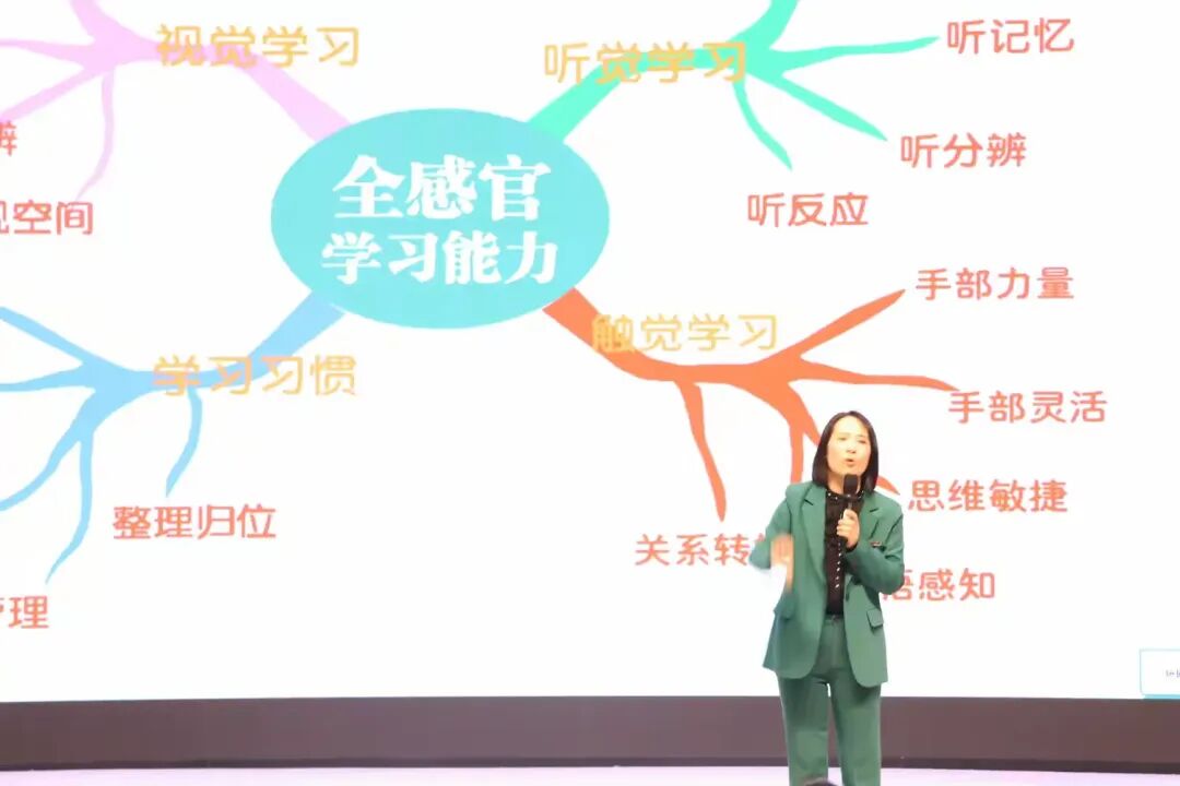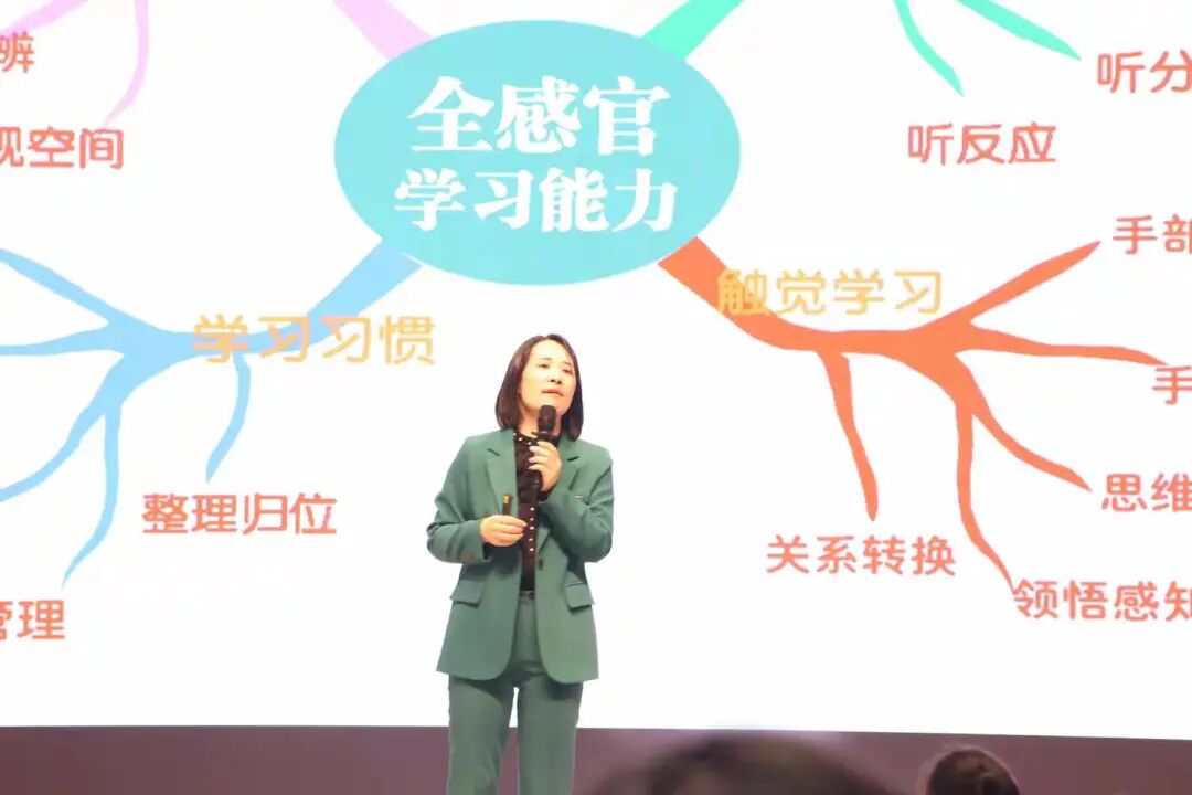 吴若瑜讲师直指当前学生心理教育的痛点:屏幕上清晰列出 “家长不会、老师不教、学校心理教育缺乏系统性持续性、学生对心理和情绪认知几乎为零”的现实困境。在“力”的提升板块,吴若瑜讲师打破了“学习能力由天赋决定”的固有认知,结合自身研发的全感官学习训练体系,详解了霍华德・加德纳的感官学习理论。她指出,不同孩子有着不同的学习偏好: