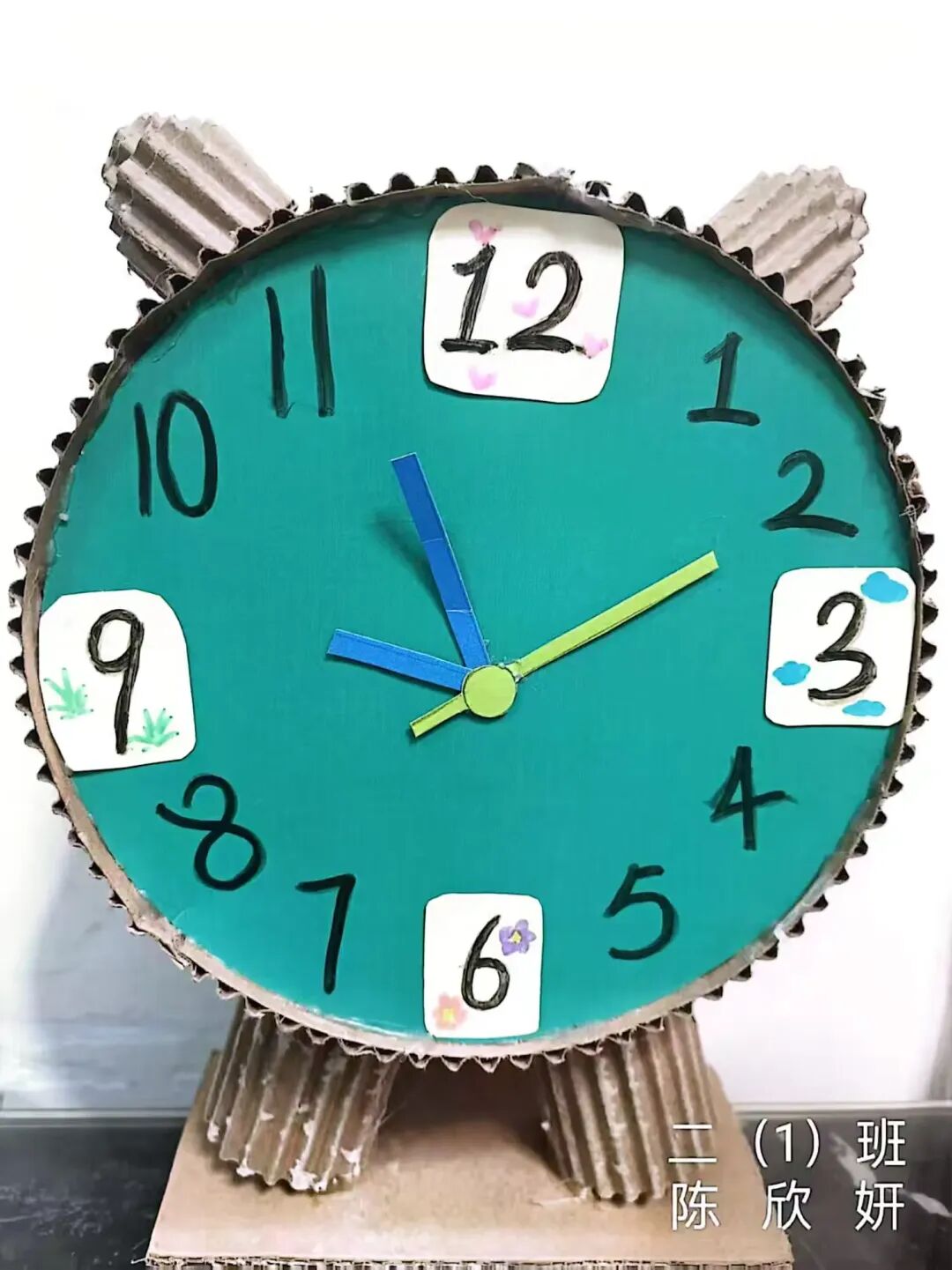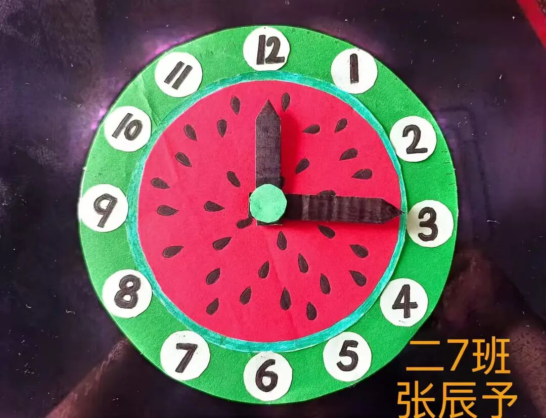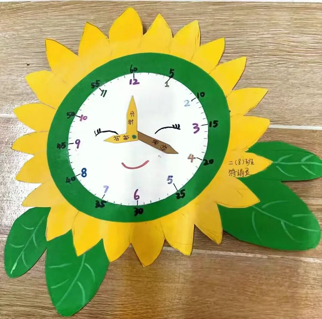 手工制作是低年级学生理解数学概念的重要方式。学生们利用彩泥、纸张等材料,制作出各种创意作品。向日葵时钟色彩鲜艳,表盘刻度清晰;彩泥时钟则通过立体造型展现了时间的流逝。还有西瓜造型手工时钟,设计独特,充满童趣。