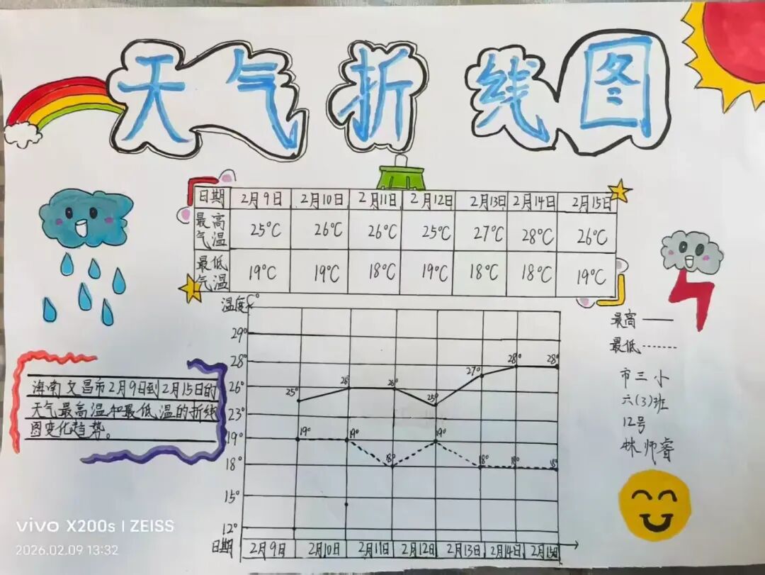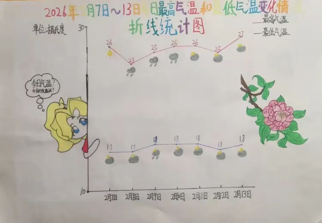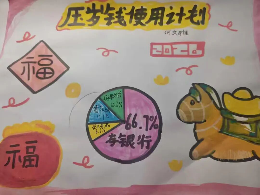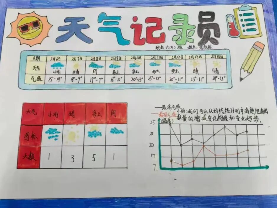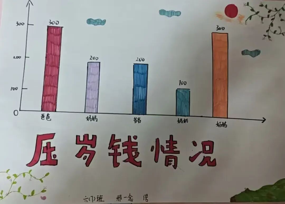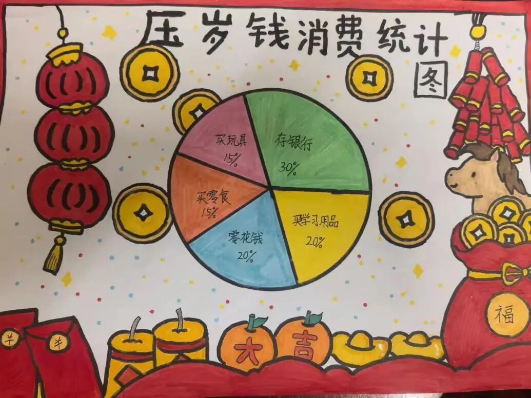 学生们通过记录天气、统计压岁钱等实践活动,掌握数据整理与分析能力。手绘天气统计图清晰呈现数据趋势,展示气温变化。压岁钱情况图表和消费统计主题插画手抄报,则将数学与生活理财结合,培养了实用技能。