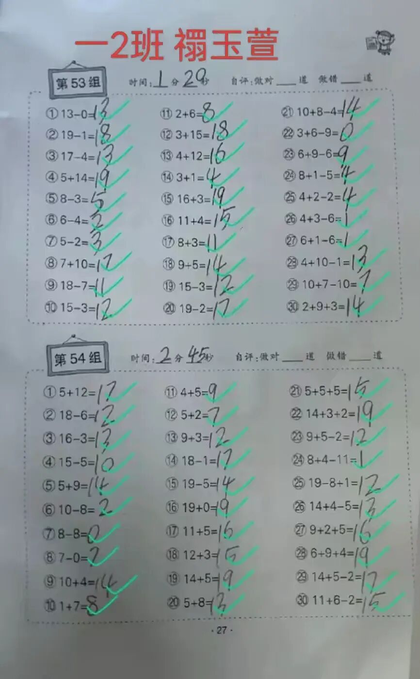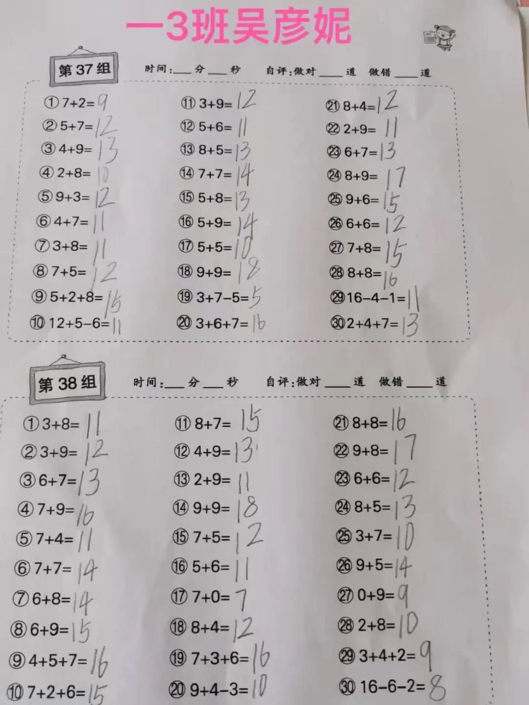 低年级学生通过计算题作业巩固基础,字迹工整,计算准确,展现了良好的学习习惯。