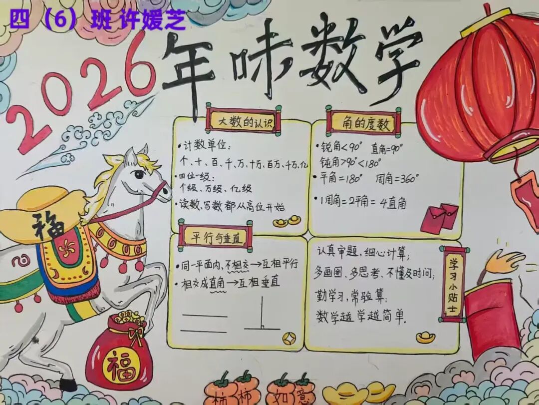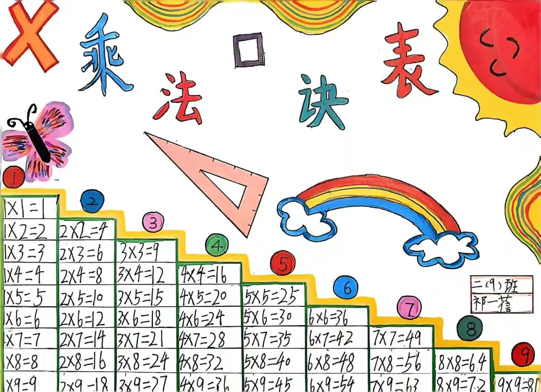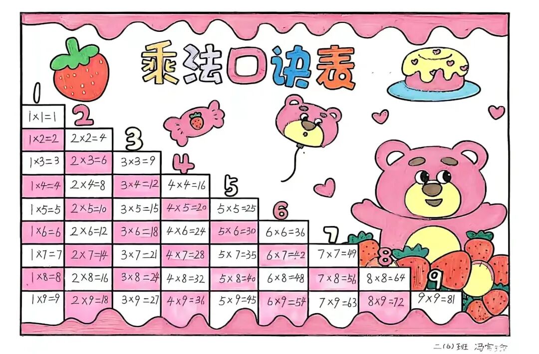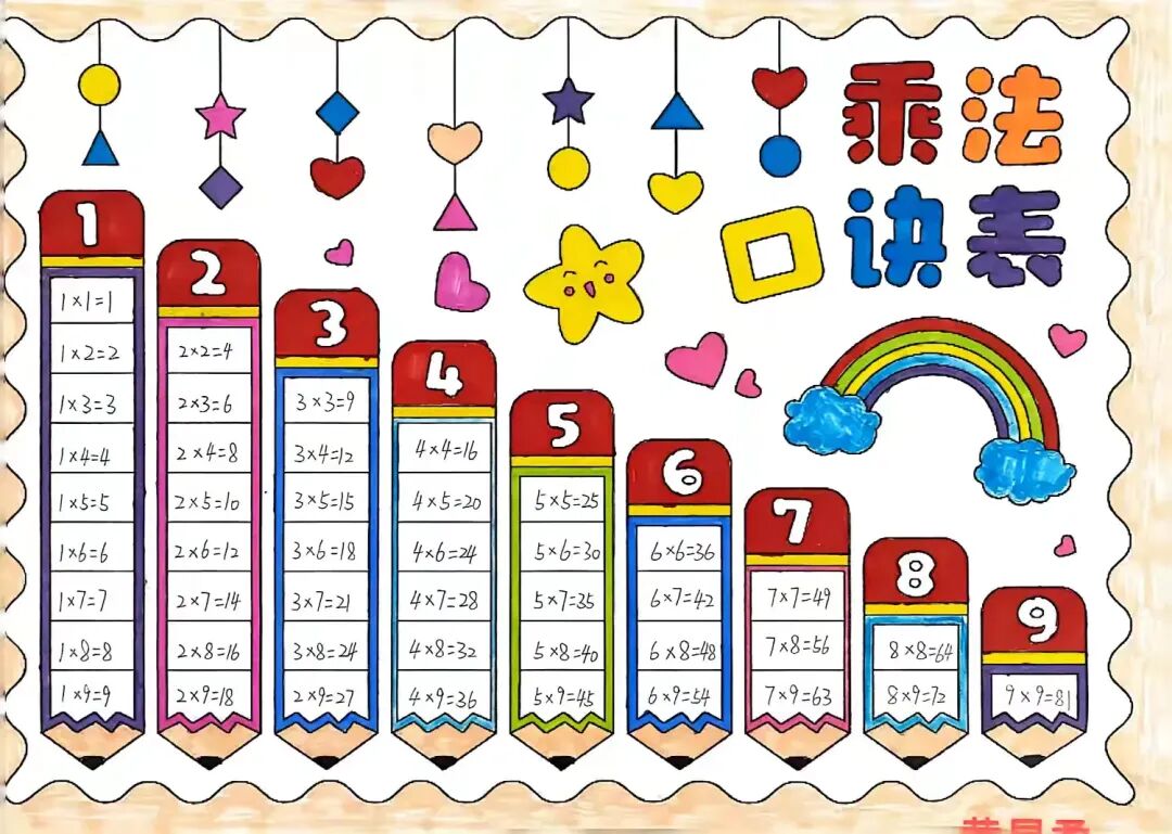 寒假期间,学生通过手抄报将数学知识与生活场景结合,内容丰富,设计美观。而手绘乘法口诀表插画色彩明亮,卡通风格有趣生动,让抽象的口诀变得生动有趣。