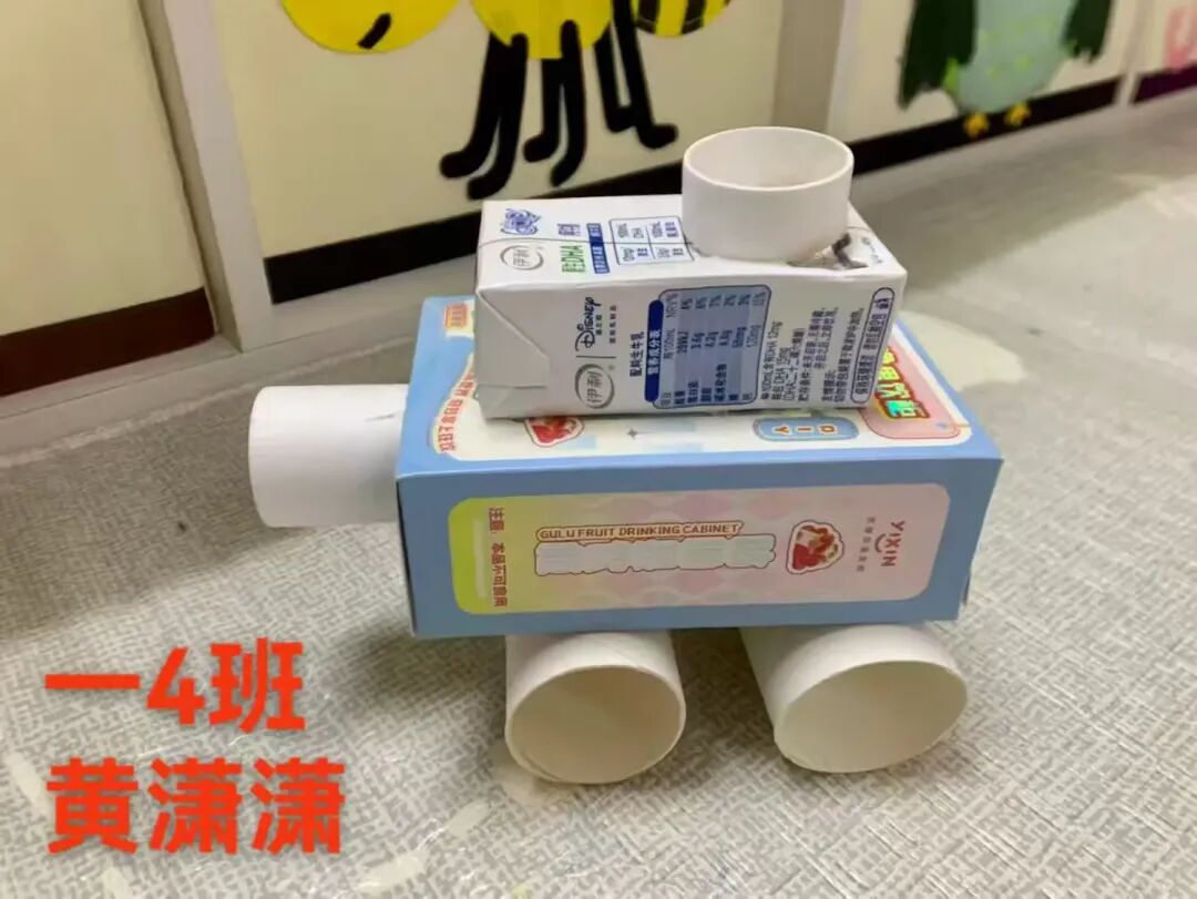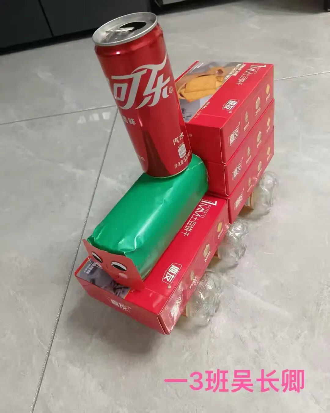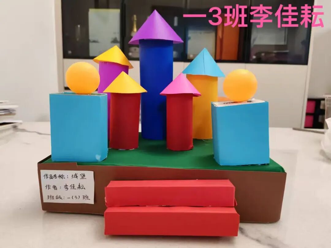 此外,彩色城堡模型和手工黄色纸校车,将几何图形与空间想象结合,展现了数学在建筑中的应用。用可乐物品、红色纸杯搭建的创意造型,则体现了废物利用与数学美感的结合。