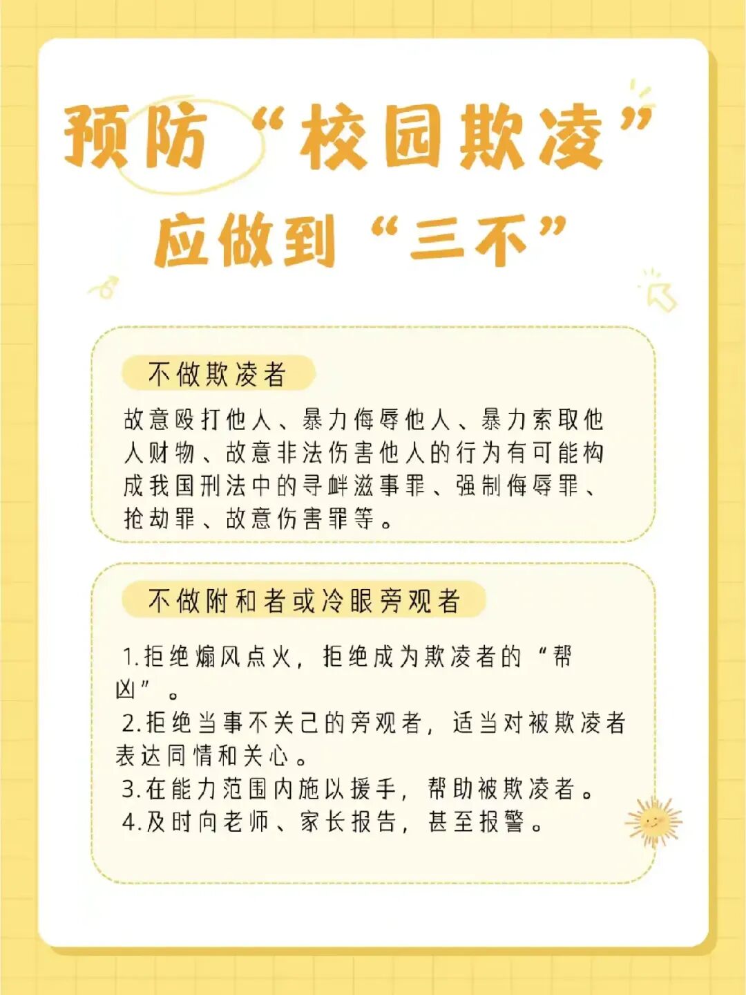 1.明确校园欺凌法定范畴,认清肢体、语言、社交、网络等恶意伤害行为,坚决不做欺凌者、不做冷漠旁观者、不做无助受害者。
