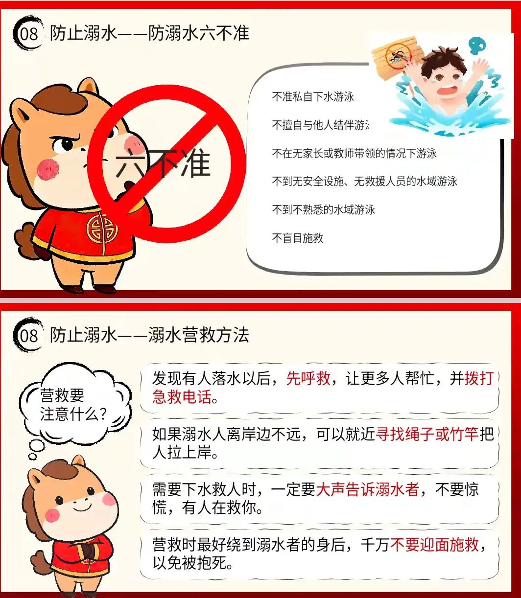 严格落实“防溺水六不准”:不准私自下水游泳,不擅自与他人结伴游泳,不在无家长或教师带领的情况下游泳,不到无安全设施、无救援人员的水域游泳,不到不熟悉的水域游泳,不盲目施救。发现有人落水时,先呼救并拨打急救电话,可就近寻找绳子、竹竿等工具施救,切勿盲目下水,避免二次伤害。