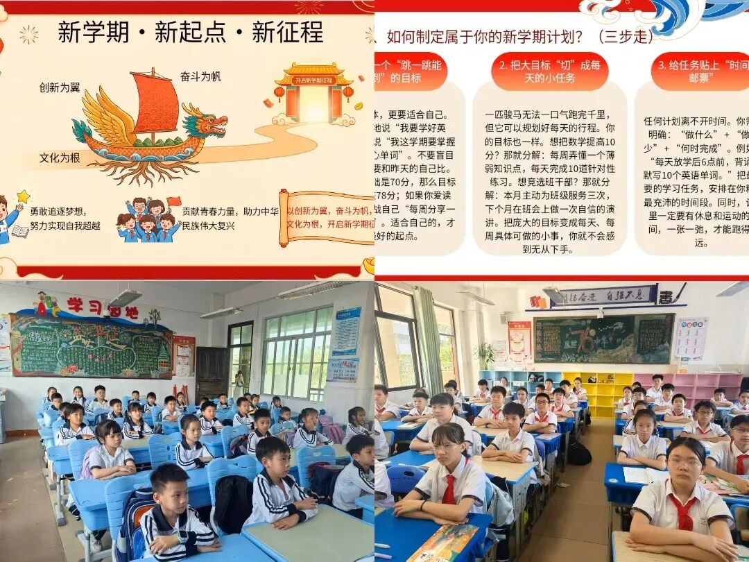 班会最后,师生共同探讨新学期目标制定的方法,明确要设立“跳一跳能够到”的具体目标,将大目标分解为每日可完成的小任务,做好时间规划,坚持今日事今日毕,定期复盘调整。在互动与思考中,同学们凝聚起奋进的力量,以饱满的精神状态迎接新学期的学习挑战。