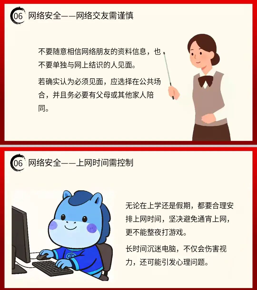 教育学生网络交友需谨慎,不随意相信网络朋友的资料信息,不单独与网友见面,若确需见面,选择公共场合并由家人陪同。同时合理控制上网时间,避免通宵上网、沉迷游戏,保护视力与心理健康;遵守网络文明规范,不传播不良信息,不随意点击陌生链接,防范网络诈骗,守护个人信息安全。