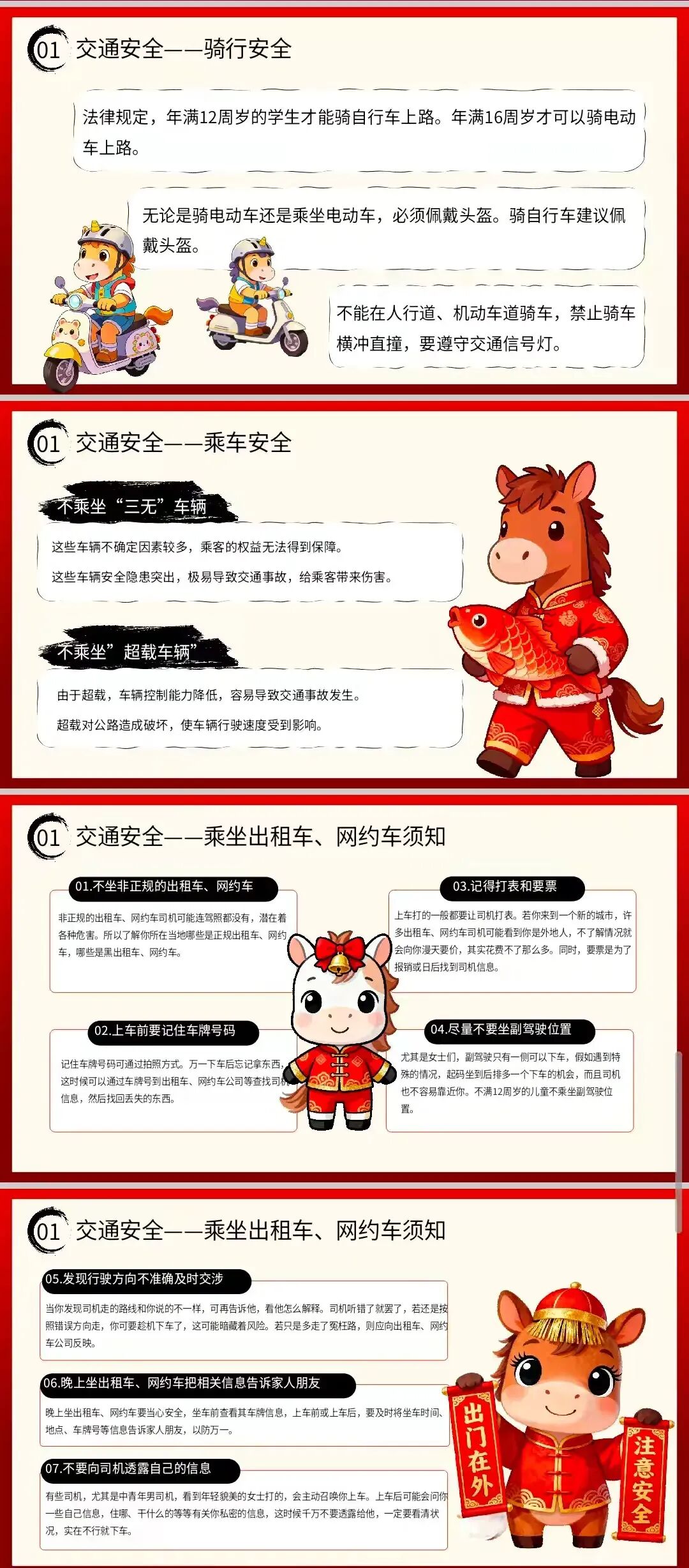 重点强调骑行与乘车安全:法律规定年满12周岁才能骑自行车上路,年满16周岁才能骑电动车上路;骑乘电动车必须佩戴头盔,骑自行车建议佩戴头盔;不在人行道、机动车道骑车,遵守交通信号灯。乘车时不将头、手伸出窗外,不乘坐无牌无证车辆;乘坐出租车、网约车时,核对车辆信息,不随意透露个人信息,下车后确认随身物品,提高出行安全意识。