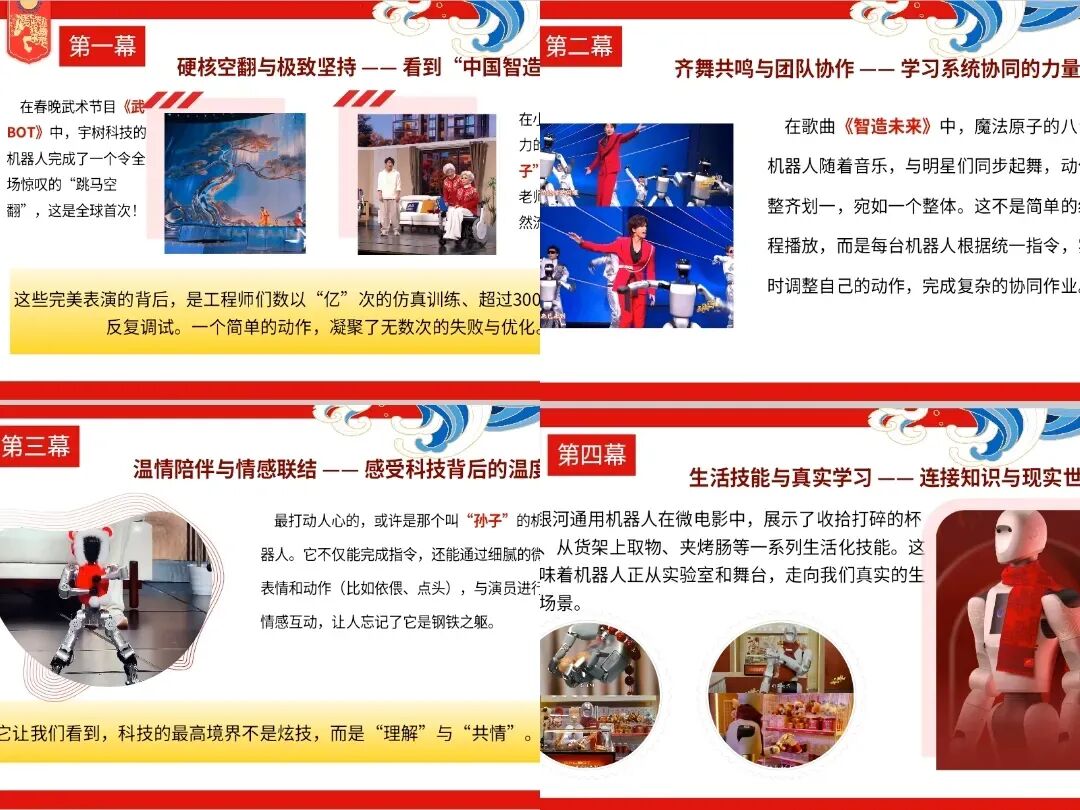 本次班会更以2026年科技春晚为契机,带领学生感受“中国智造”的魅力。春晚舞台上,机器人完成全球首次跳马空翻、八台机器人齐舞共鸣、温情满满的机器人互动,还有走进生活的机器人技能展示,这些精彩瞬间背后,是极致的坚持、默契的团队协作、温暖的人文关怀,更是知识与现实的深度联结。同学们从科技盛宴中汲取成长力量,懂得卓越来自反复打磨,成功源于同心协力。