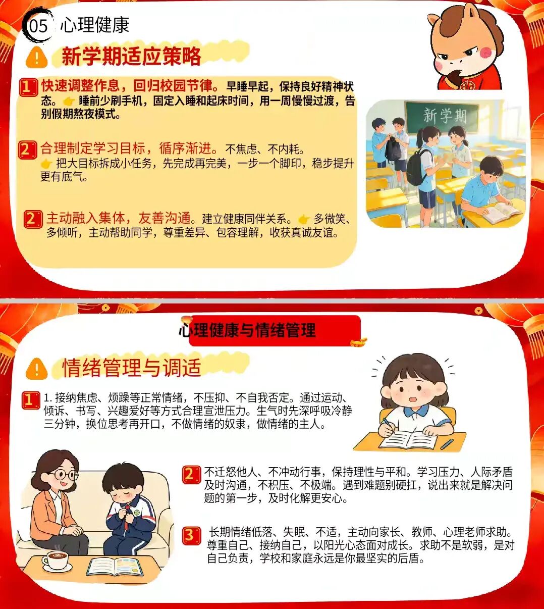 聚焦新学期学生可能出现的适应焦虑、学习压力等问题,开展针对性心理疏导。引导学生快速调整作息,回归校园节律,早睡早起,减少手机使用,告别熬夜模式;合理制定学习目标,循序渐进,不焦虑、不内耗;主动融入集体,友善沟通,建立健康同伴关系。同时教会学生接纳焦虑、烦躁等正常情绪,通过运动、倾诉、书写等方式合理宣泄压力,遇到长期情绪低落时主动向家长、老师、心理老师求助,以阳光心态面对各项挑战,筑牢心灵防护墙。