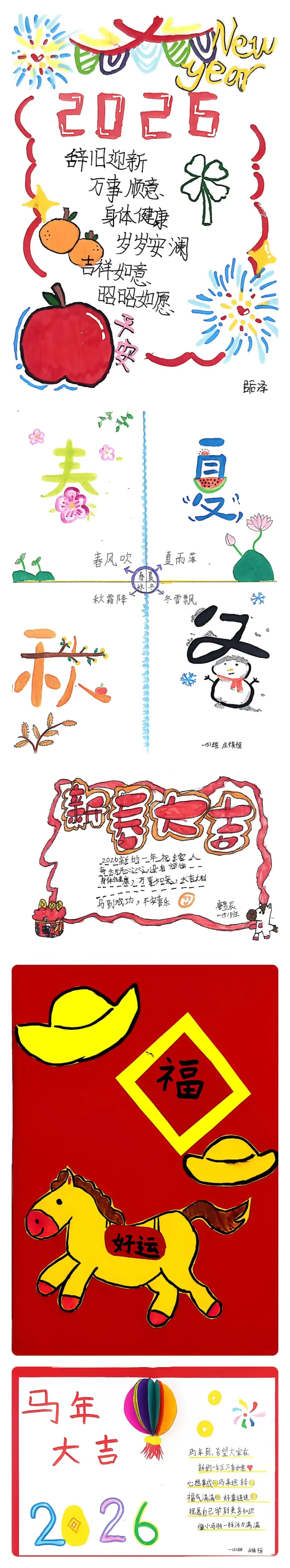 新春佳节,喜气洋洋。同学们以“贺新春”为主题,创意贺卡,剪纸窗花、马年新春邮票等作品。红彤彤的色彩、吉祥的图案、美好的祝福语,将新春的喜庆与祝福跃然纸上,用艺术的方式传递新年喜悦,表达对新年的美好期盼,感受中华传统年俗文化的独特魅力。