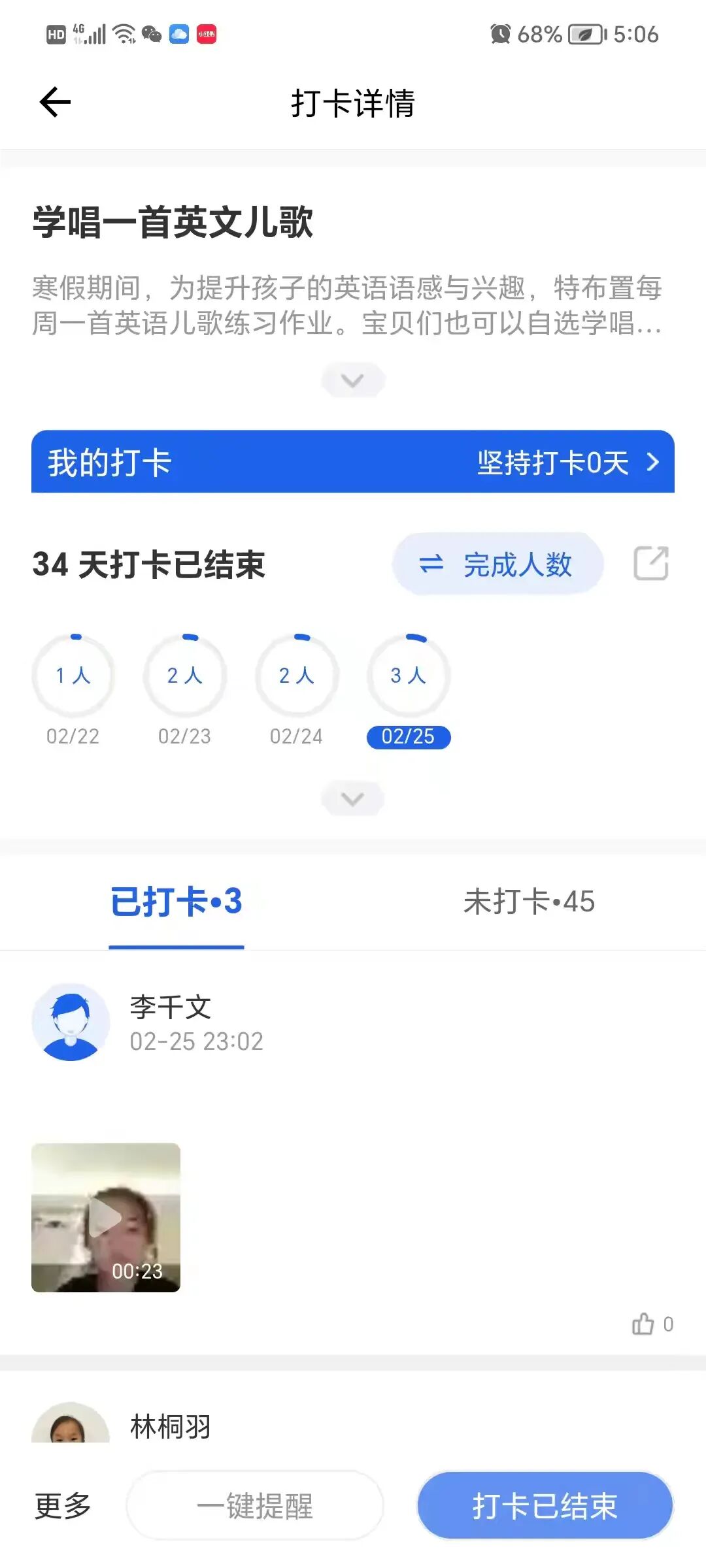 在书桌前、阳台边、客厅里,都是孩子们认真演唱的小小身影,稚嫩的嗓音跟着旋律轻扬,一句句英文歌词在反复吟唱中变得熟悉,一个个陌生单词在欢快节奏里轻松掌握。没有枯燥的背诵,没有生硬的认读,孩子们在歌唱中感受英语的韵律之美,在打卡中培养坚持的良好习惯,原本平淡的寒假时光,因这声声吟唱变得充实又有趣。