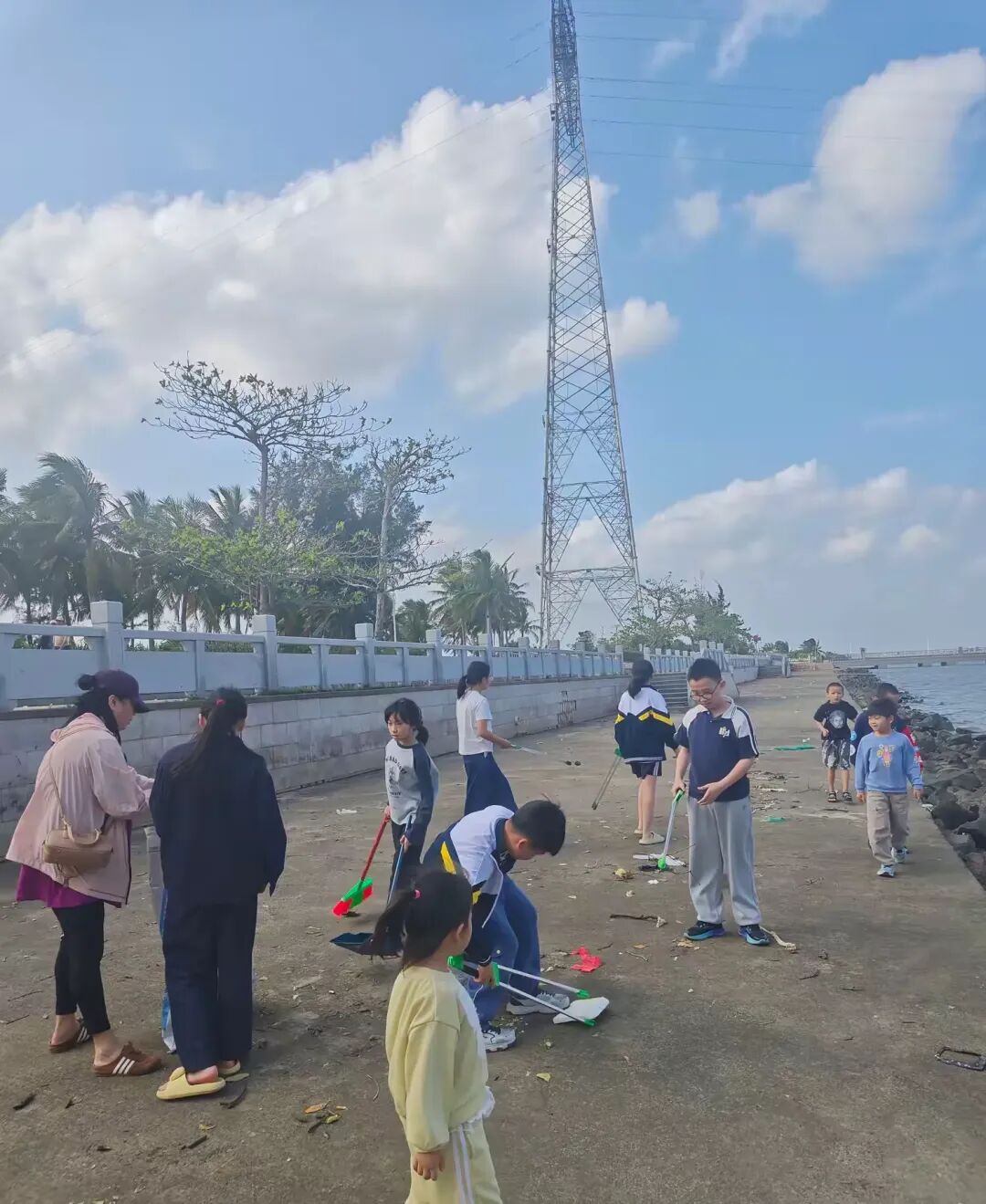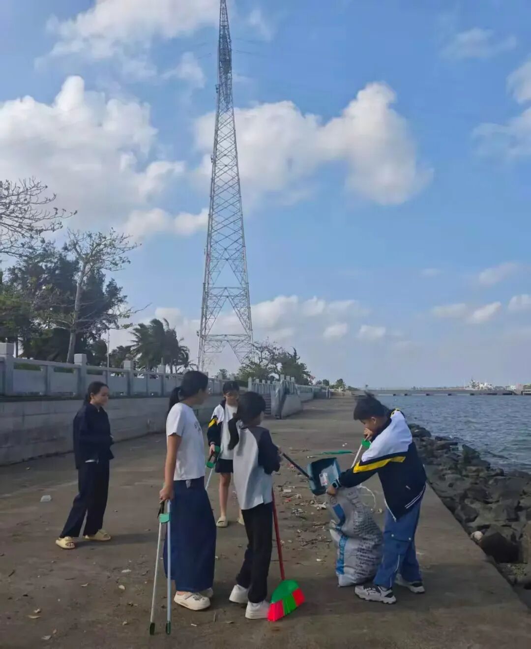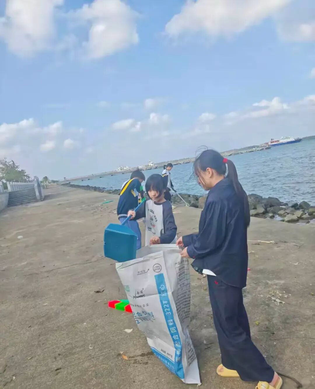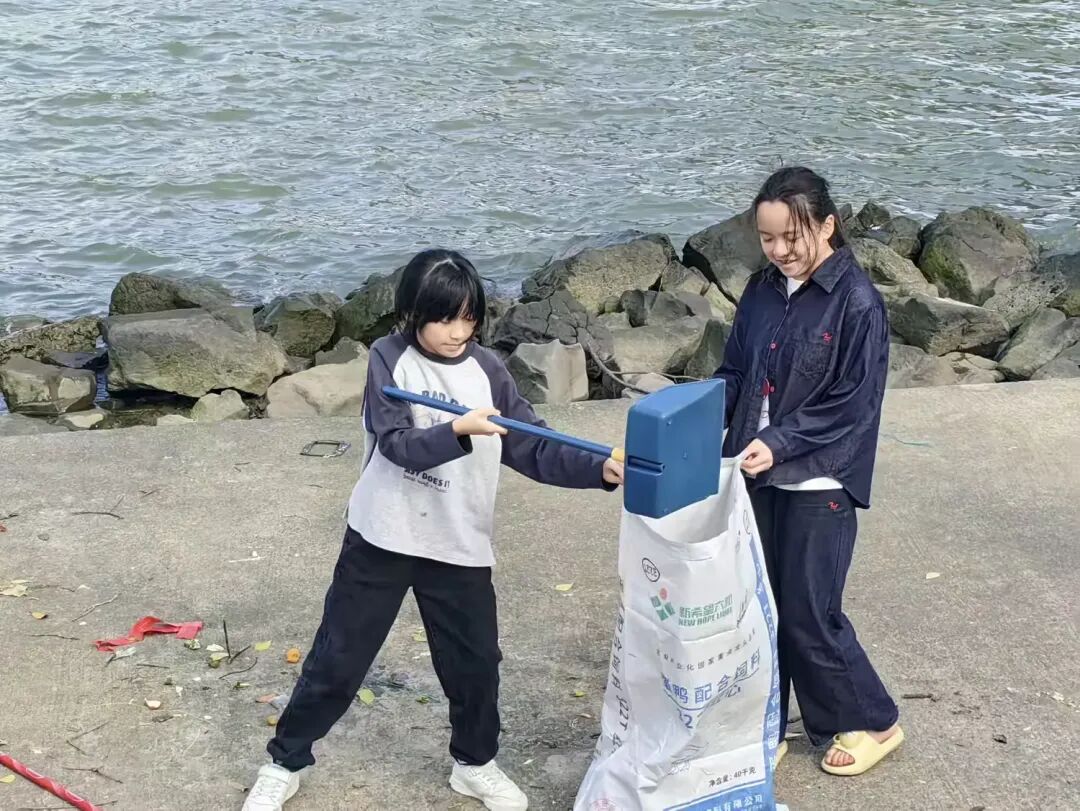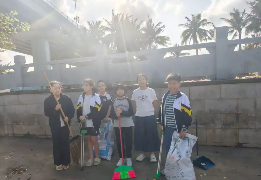 经过小同学们的辛勤劳动,公园内的海防垃圾被清理得干干净净,地面恢复了整洁,滨海风光显得愈发秀丽。
