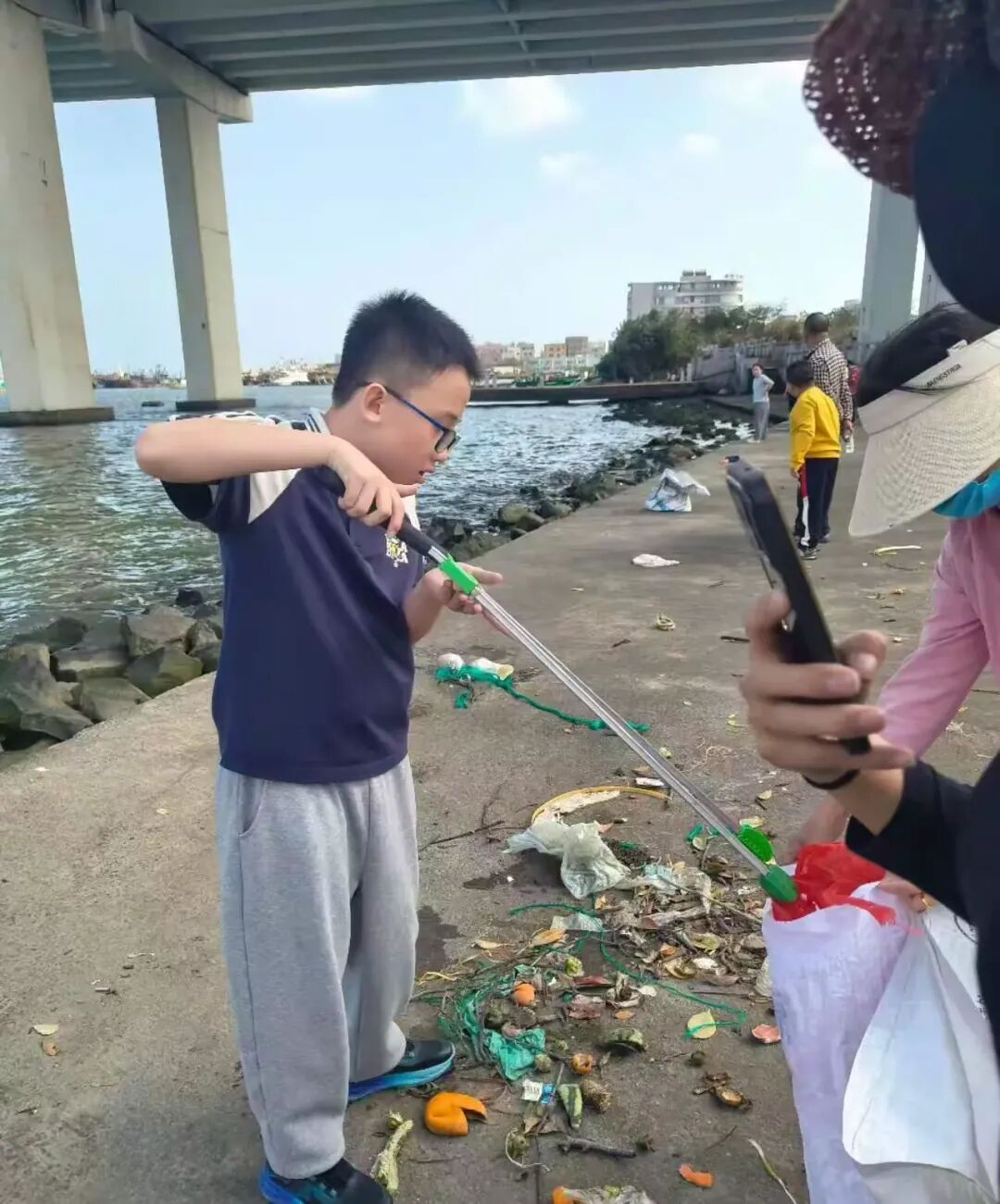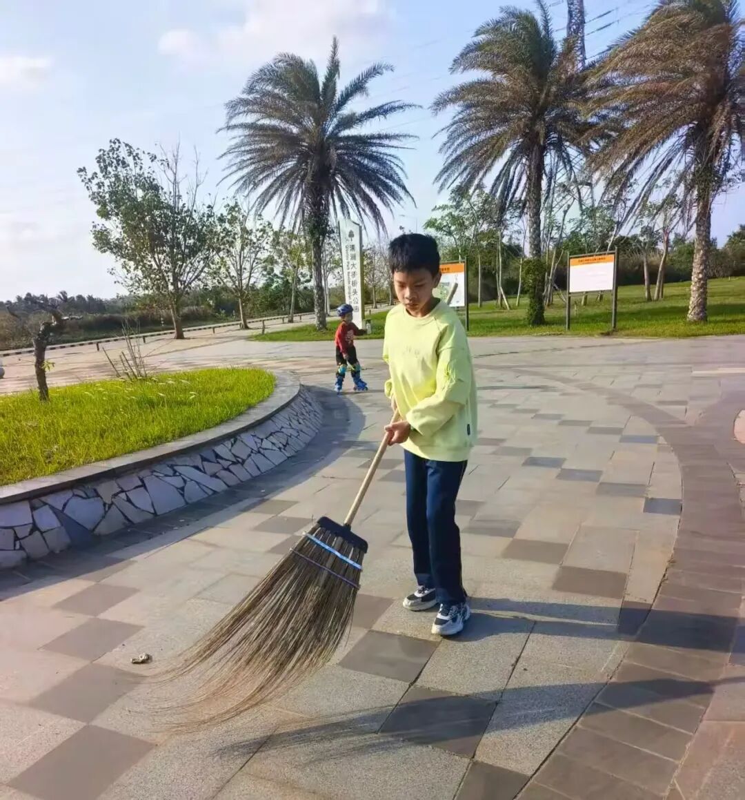 小小的身影穿梭在公园的各个角落,专注的神情、认真的动作,成为了清澜大桥下最动人的风景。