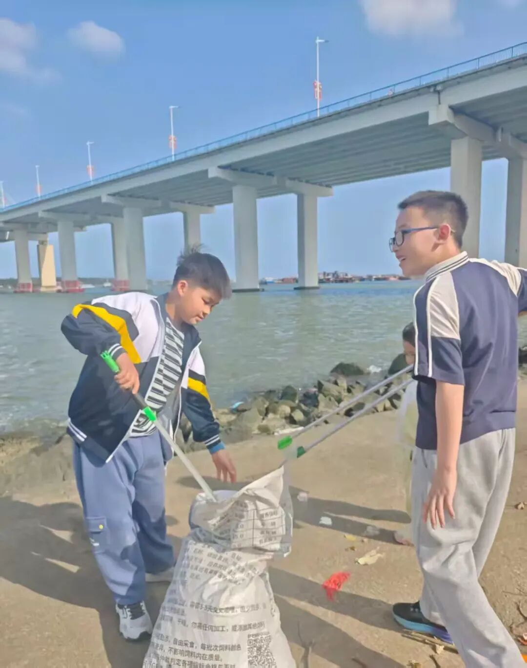 七位同学来到这里,带着提前准备好的工具,化身“海防小卫士”,开启了垃圾清理行动。