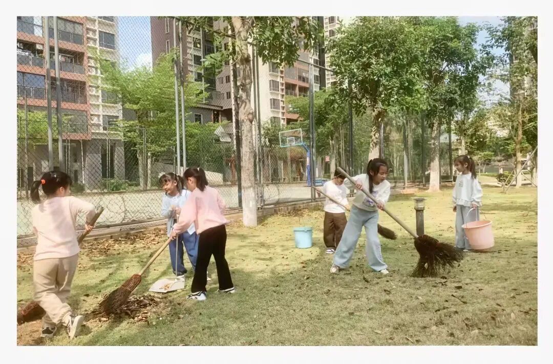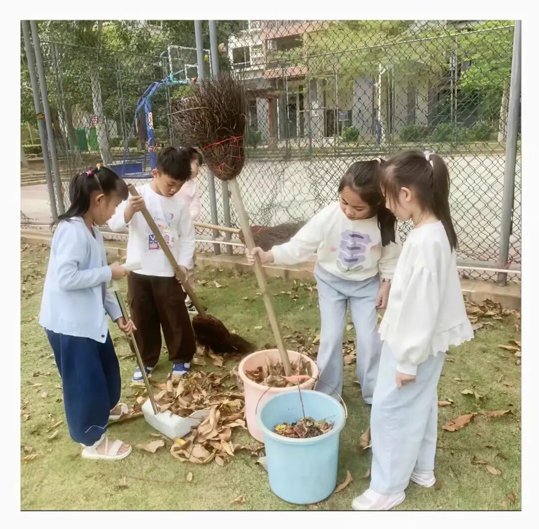 有的握着比自己个子还高的大扫帚,小脸蛋憋得通红,正合力清扫草坪上的落叶。