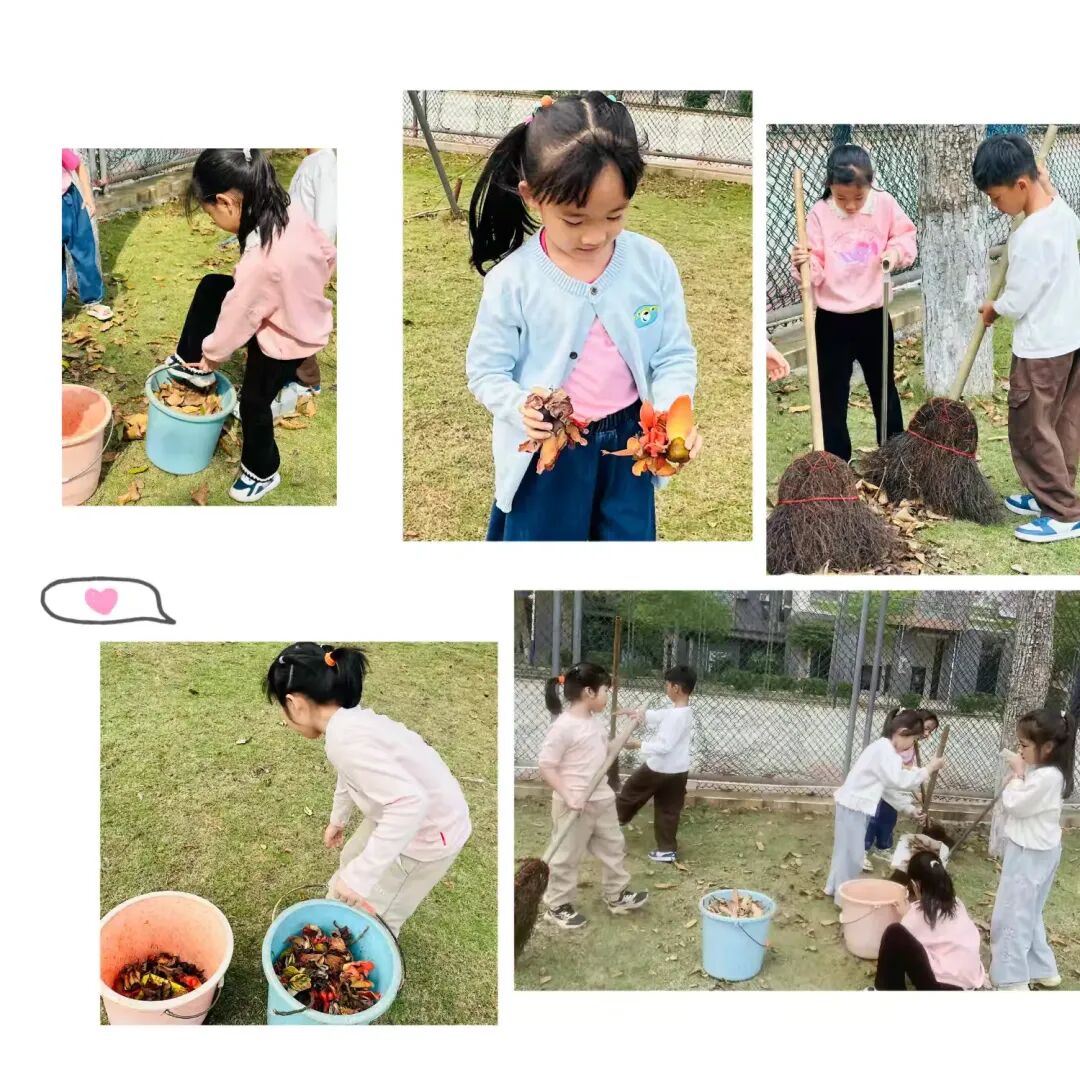 还有小朋友拎着小桶在旁边帮忙打下手,不一会儿功夫,草坪上散落的枯叶就被收拾得干干净净。