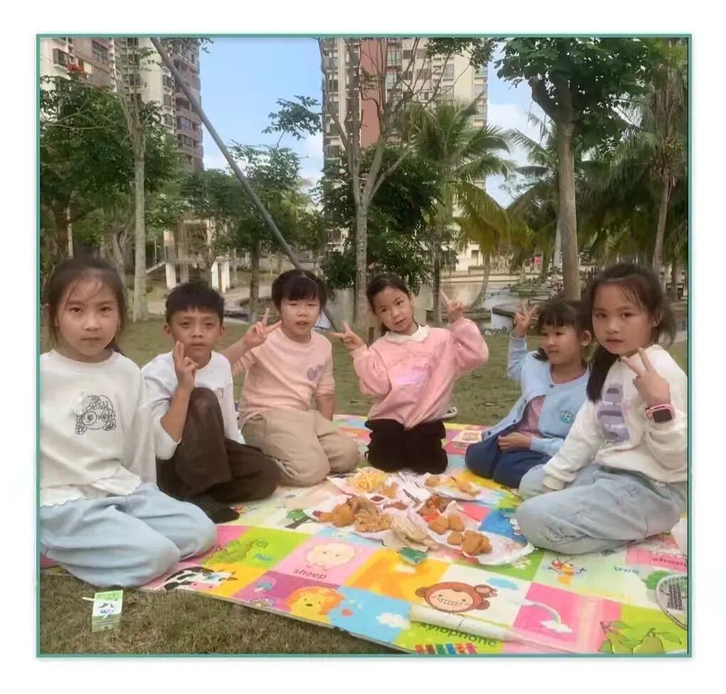 大扫除的任务告一段落,满头是汗的小家伙们终于迎来了美食分享时刻。大家齐刷刷围坐在草坪的树荫下,纷纷掏出藏在小书包里的“宝藏”:外皮香酥的炸鸡块、冰爽解渴的王老吉、金黄酥脆的现炸薯条,不一会儿就在面前的野餐布上堆得满满当当。